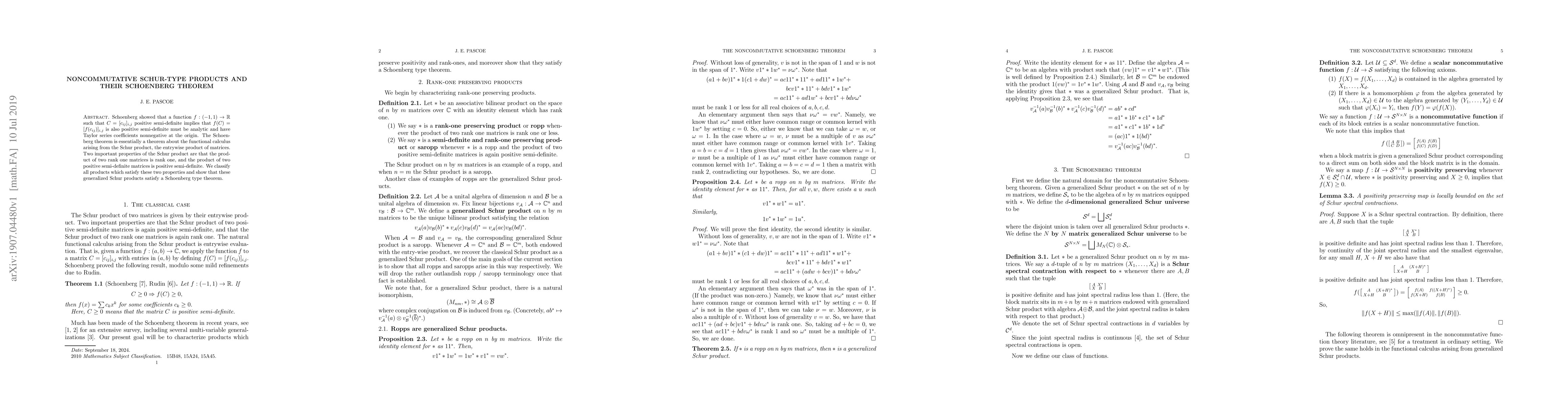 Schoenberg showed that a function $f:(-1,1)\rightarrow \mathbb{R}$ such that $C=[c_{ij}]_{i,j}$ positive semi-definite implies that $f(C)=[f(c_{ij})]_{i,j}$ is also positive semi-definite must be analytic and have Taylor series coefficients nonnegative at the origin. The Schoenberg theorem is essentially a theorem about the functional calculus arising from the Schur product, the entrywise product of matrices. Two important properties of the Schur product are that the product of two rank one matrices is rank one, and the product of two positive semi-definite matrices is positive semi-definite. We classify all products which satisfy these two properties and show that these generalized Schur products satisfy a Schoenberg type theorem.