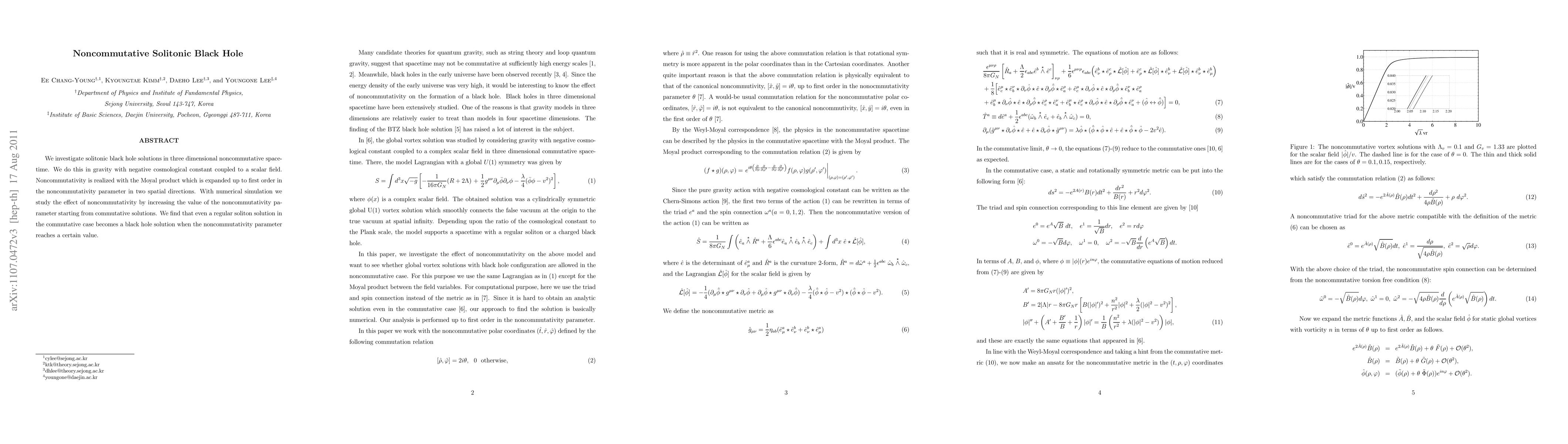 We investigate solitonic black hole solutions in three dimensional noncommutative spacetime. We do this in gravity with negative cosmological constant coupled to a scalar field. Noncommutativity is realized with the Moyal product which is expanded up to first order in the noncommutativity parameter in two spatial directions. With numerical simulation we study the effect of noncommutativity by increasing the value of the noncommutativity parameter starting from commutative solutions. We find that even a regular soliton solution in the commutative case becomes a black hole solution when the noncommutativity parameter reaches a certain value.