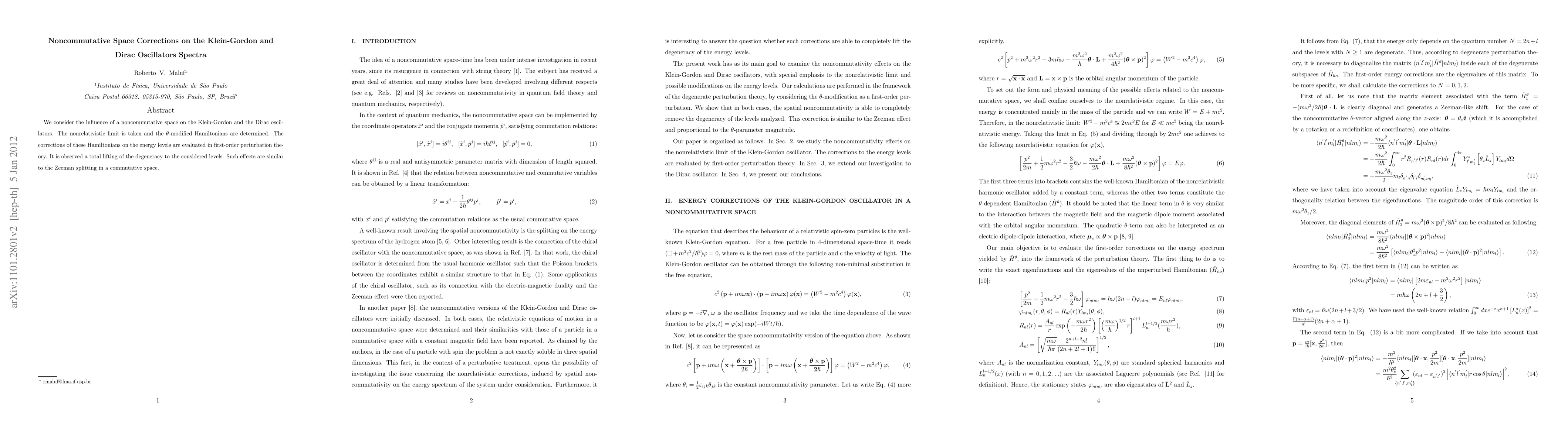 This paper investigates how noncommutative space influences the spectra of Klein-Gordon and Dirac oscillators, determining $\theta$-modified Hamiltonians and evaluating first-order perturbation corrections. The study finds a total lifting of degeneracy in the energy levels, akin to Zeeman splitting in commutative space.
