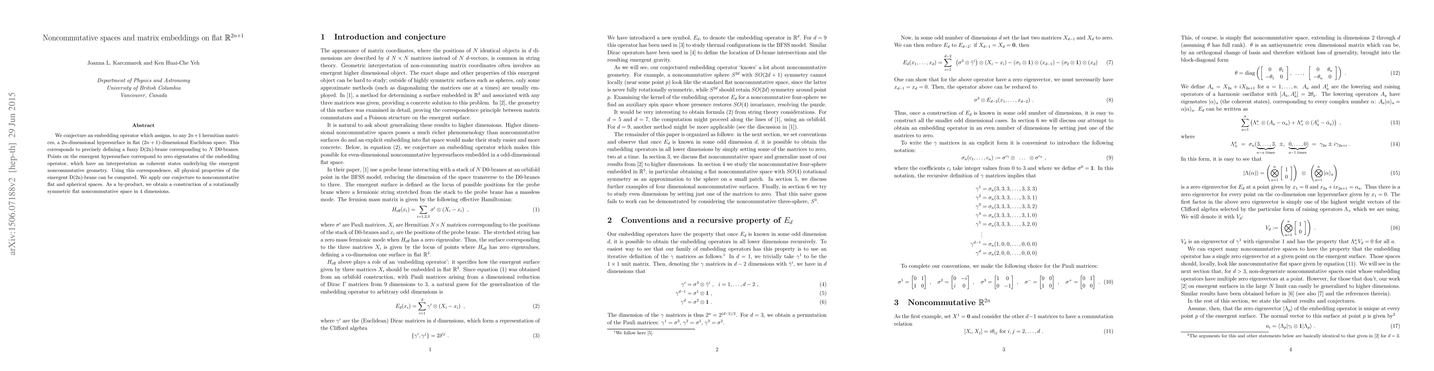 We conjecture an embedding operator which assigns, to any 2n+1 hermitian matrices, a 2n-dimensional hypersurface in flat (2n + 1)-dimensional Euclidean space. This corresponds to precisely defining a fuzzy D(2n)-brane corresponding to N D0-branes. Points on the emergent hypersurface correspond to zero eigenstates of the embedding operator, which have an interpretation as coherent states underlying the emergent noncommutative geometry. Using this correspondence, all physical properties of the emergent D(2n)-brane can be computed. We apply our conjecture to noncommutative flat and spherical spaces. As a by-product, we obtain a construction of a rotationally symmetric flat noncommutative space in 4 dimensions.