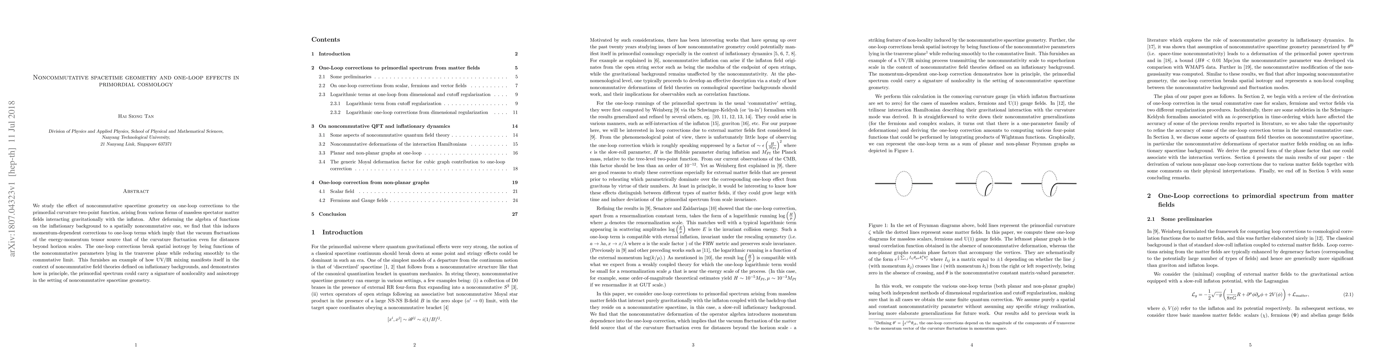 We study the effect of noncommutative spacetime geometry on one-loop corrections to the primordial curvature two-point function, arising from various forms of massless spectator matter fields interacting gravitationally with the inflaton. After deforming the algebra of functions on the inflationary background to a spatially noncommutative one, we find that this induces momentum-dependent corrections to one-loop terms which imply that the vacuum fluctuation of the energy-momentum tensor sources that of the curvature fluctuation even for distances beyond horizon scales. The one-loop corrections break spatial isotropy by being functions of the noncommutative parameters lying in the tranverse plane while reducing smoothly to the commutative limit. This furnishes an example of how UV/IR mixing manifests itself in the context of noncommutative field theories defined on inflationary backgrounds, and demonstrates how in principle, the primordial spectrum could carry a signature of nonlocality and anisotropy in the setting of noncommutative spacetime geometry.