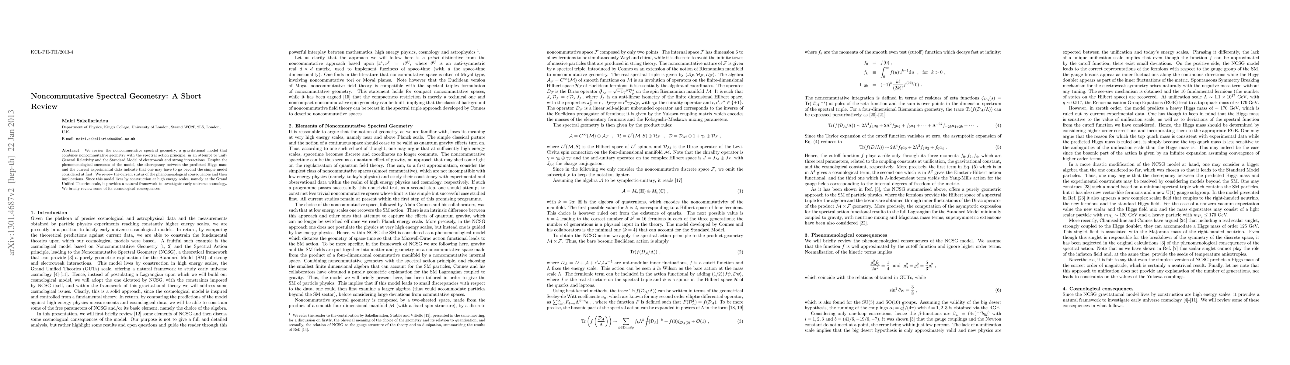 This paper reviews noncommutative spectral geometry, a model integrating noncommutative geometry with spectral action to unify General Relativity and the Standard Model, highlighting its phenomenological successes but noting discrepancies in Higgs mass predictions. It also explores the model's implications for high energy scale phenomena and early universe cosmology.