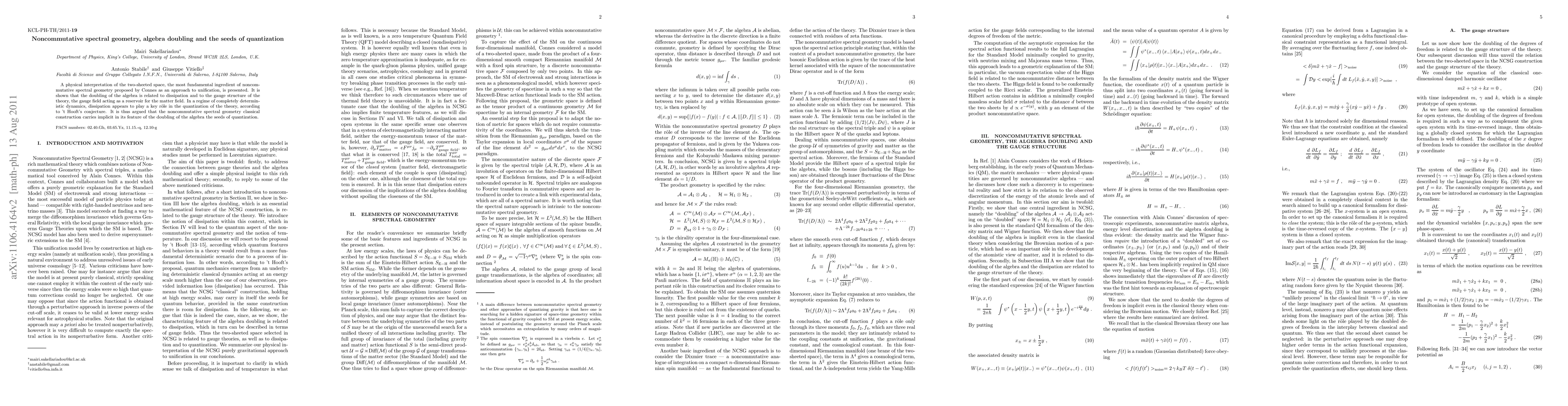 **Summary:** This paper interprets Connes' two-sheeted space in noncommutative spectral geometry, demonstrating a connection between algebra doubling, dissipation, and gauge structure, suggesting that dissipation underlies quantization in deterministic dynamics, hinting that algebra doubling inherently contains the foundations for quantization.