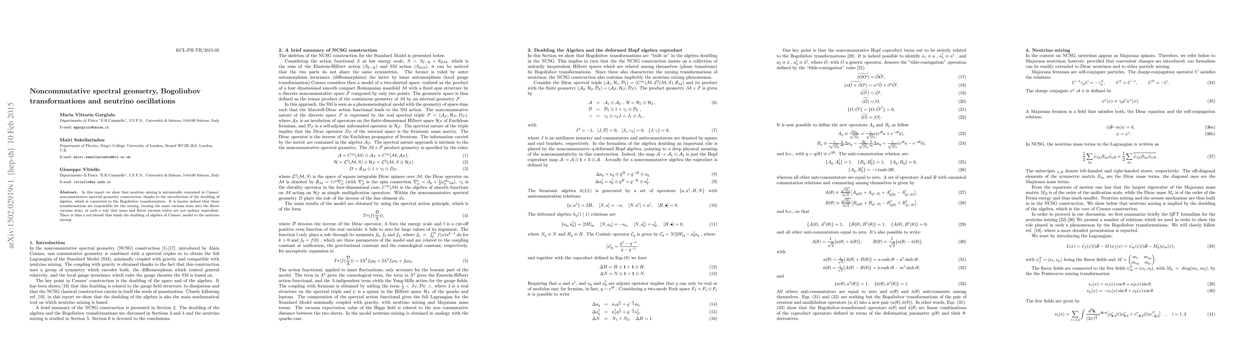 In this report we show that neutrino mixing is intrinsically contained in Connes' noncommutative spectral geometry construction, thanks to the introduction of the doubling of algebra, which is connected to the Bogoliubov transformation. It is known indeed that these transformations are responsible for the mixing, turning the mass vacuum state into the flavor vacuum state, in such a way that mass and flavor vacuum states are not unitary equivalent. There is thus a red thread that binds the doubling of algebra of Connes' model to the neutrino mixing.