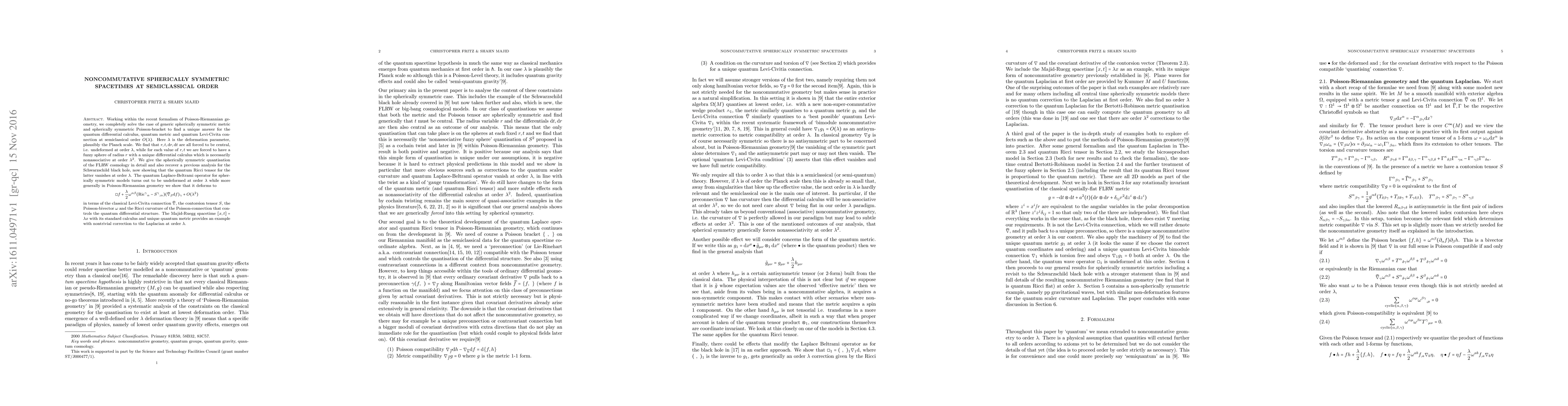 Working within the recent formalism of Poisson-Riemannian geometry, we completely solve the case of generic spherically symmetric metric and spherically symmetric Poisson-bracket to find a unique answer for the quantum differential calculus, quantum metric and quantum Levi-Civita connection at semiclassical order $O(\lambda)$. Here $\lambda$ is the deformation parameter, plausibly the Planck scale. We find that $r,t,dr,dt$ are all forced to be central, i.e. undeformed at order $\lambda$, while for each value of $r,t$ we are forced to have a fuzzy sphere of radius $r$ with a unique differential calculus which is necessarily nonassociative at order $\lambda^2$. We give the spherically symmetric quantisation of the FLRW cosmology in detail and also recover a previous analysis for the Schwarzschild black hole, now showing that the quantum Ricci tensor for the latter vanishes at order $\lambda$. The quantum Laplace-Beltrami operator for spherically symmetric models turns out to be undeformed at order $\lambda$ while more generally in Poisson-Riemannian geometry we show that it deforms to \[ \square f+{\lambda\over 2}\omega^{\alpha\beta}({\rm Ric}^\gamma{}_\alpha-S^\gamma{}_{;\alpha})(\widehat\nabla_\beta d f)_\gamma + O(\lambda^2)\] in terms of the classical Levi-Civita connection $\widehat\nabla$, the contorsion tensor $S$, the Poisson-bivector $\omega$ and the Ricci curvature of the Poisson-connection that controls the quantum differential structure. The Majid-Ruegg spacetime $[x,t]=\lambda x$ with its standard calculus and unique quantum metric provides an example with nontrivial correction to the Laplacian at order $\lambda$.