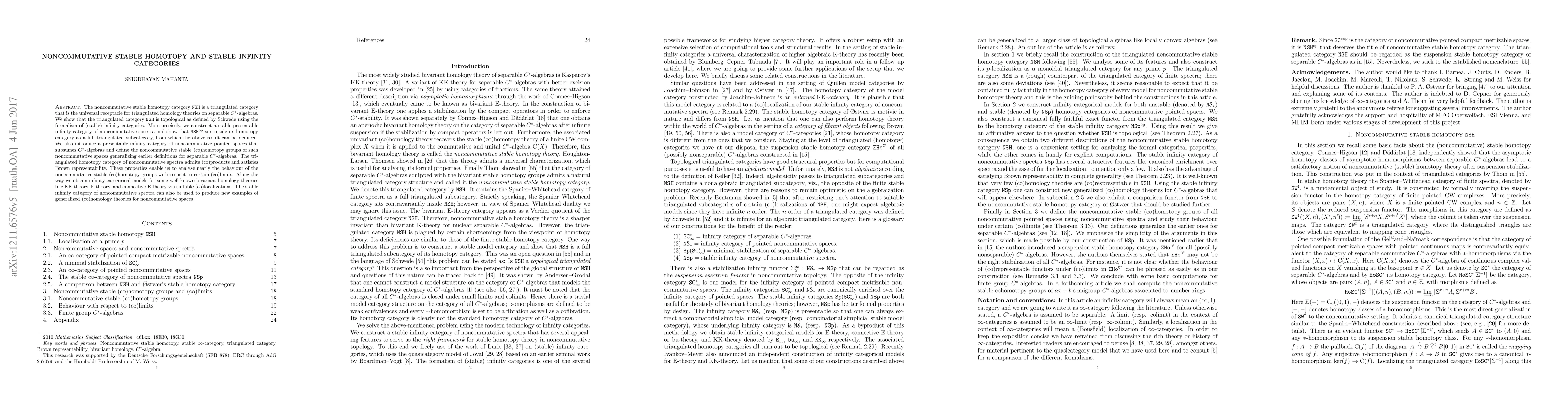 This paper constructs a stable presentable infinity category for noncommutative spectra, demonstrating that the noncommutative stable homotopy category $\mathtt{NSH}$ is topological. It introduces noncommutative stable (co)homotopy groups and presents new examples of generalized (co)homology theories via infinity categorical models for $\mathrm{KK}$-theory, $\mathrm{E}$-theory, and connective $\mathrm{E}$-theory.