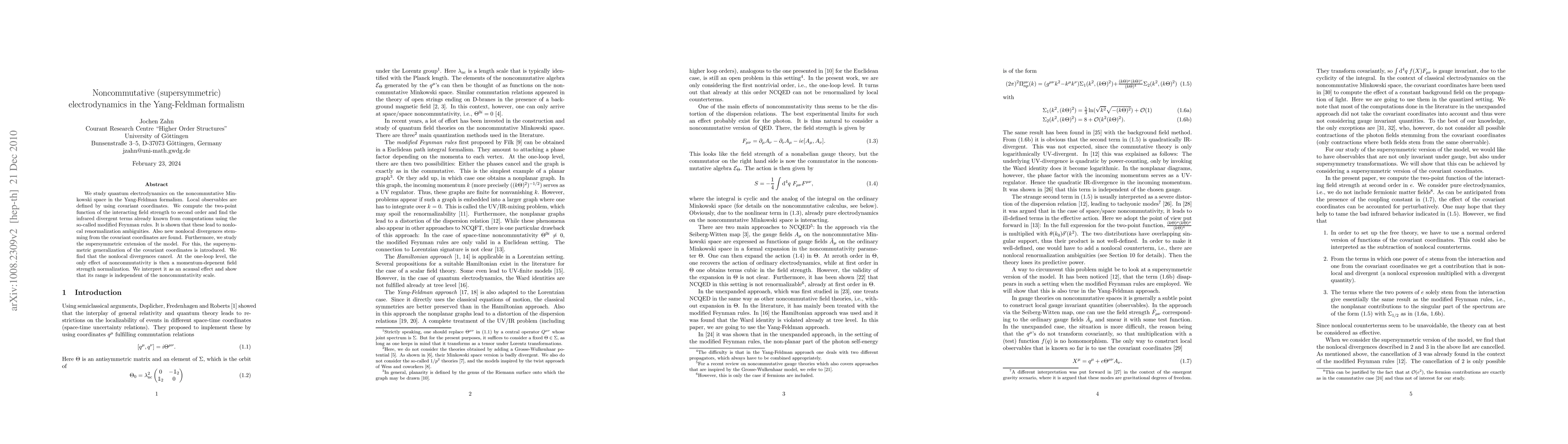 We study quantum electrodynamics on the noncommutative Minkowski space in the Yang-Feldman formalism. Local observables are defined by using covariant coordinates. We compute the two-point function of the interacting field strength to second order and find the infrared divergent terms already known from computations using the so-called modified Feynman rules. It is shown that these lead to nonlocal renormalization ambiguities. Also new nonlocal divergences stemming from the covariant coordinates are found. Furthermore, we study the supersymmetric extension of the model. For this, the supersymmetric generalization of the covariant coordinates is introduced. We find that the nonlocal divergences cancel. At the one-loop level, the only effect of noncommutativity is then a momentum-depenent field strength normalization. We interpret it as an acausal effect and show that its range is independent of the noncommutativity scale.