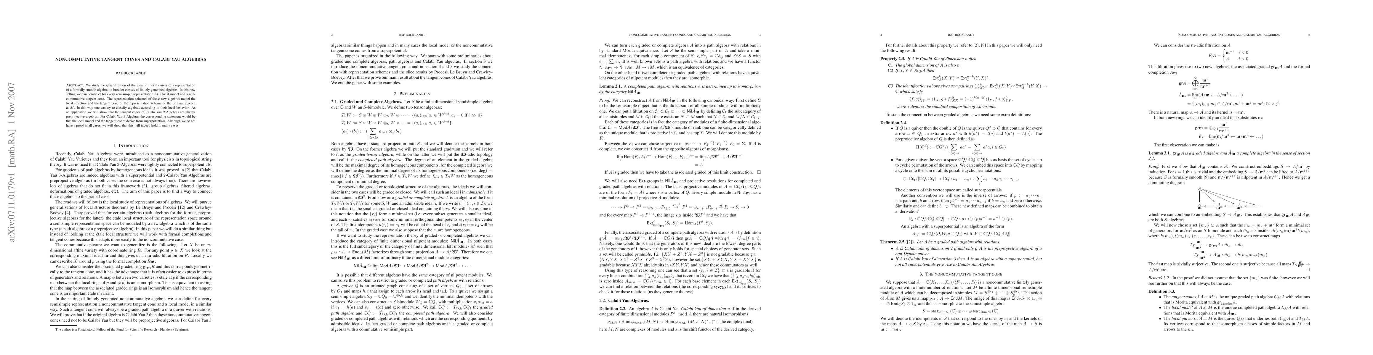 This paper explores the construction of noncommutative tangent cones for semisimple representations of finitely generated algebras, generalizing local quiver concepts. It demonstrates that these tangent cones for Calabi Yau 2 algebras are always preprojective algebras, and provides evidence that similar structures apply to Calabi Yau 3 algebras derived from superpotentials, though full proof is not yet established.
