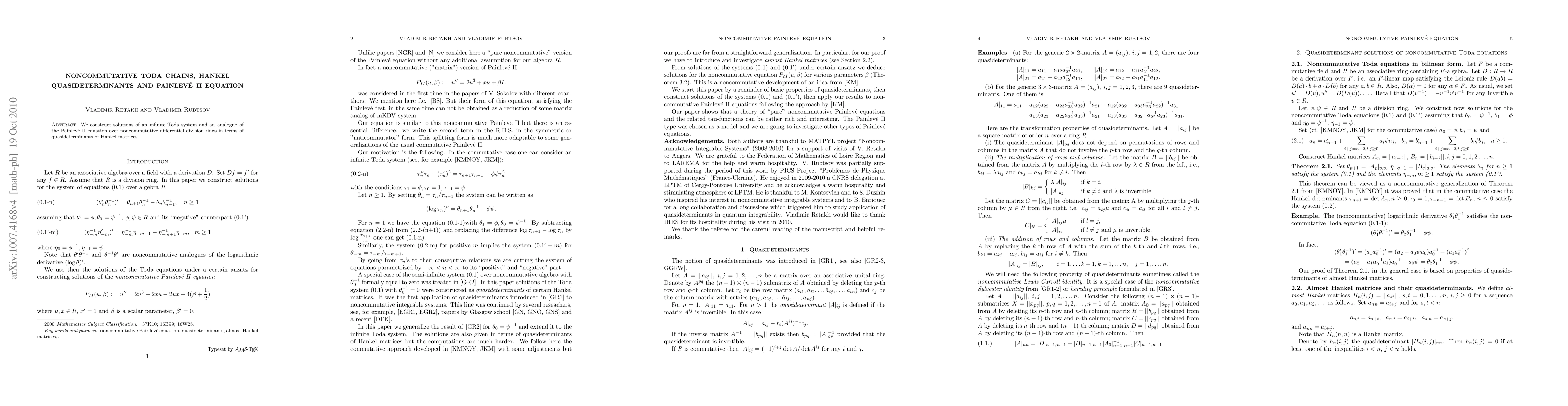 Summary: This paper constructs solutions of a noncommutative Toda system and a Painlevé II analogue using quasideterminants of Hankel matrices over noncommutative differential division rings. The approach provides new insights into the structure of these equations in noncommutative settings.