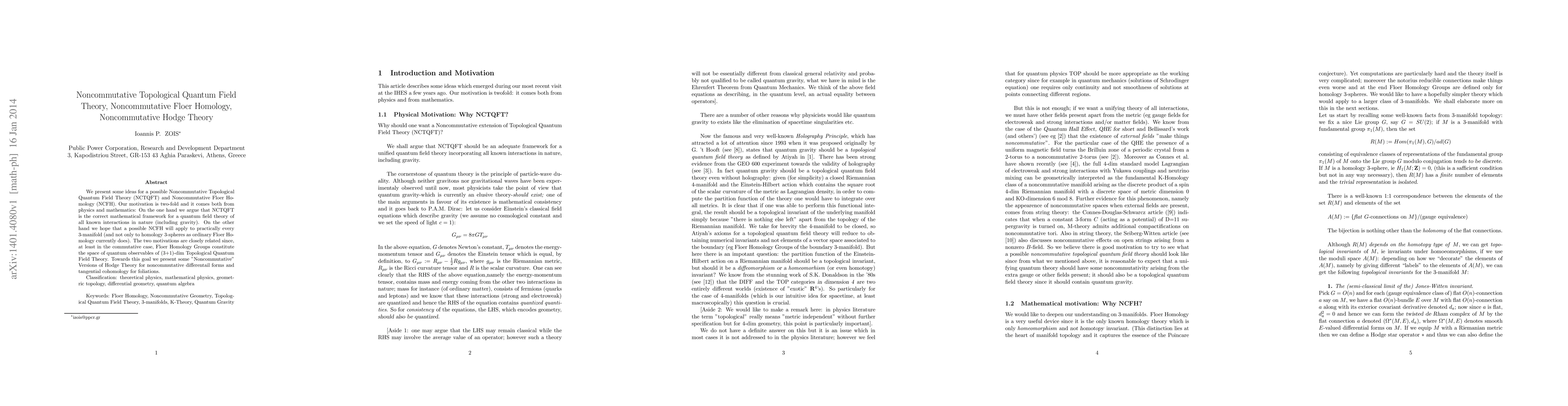 This paper explores the potential for developing a Noncommutative Topological Quantum Field Theory (NCTQFT) and Noncommutative Floer Homology (NCFH), driven by both physical and mathematical motivations. It proposes that NCTQFT could encompass all known interactions, including gravity, while NCFH could extend to any 3-manifold, contrasting with the limitations of ordinary Floer Homology.