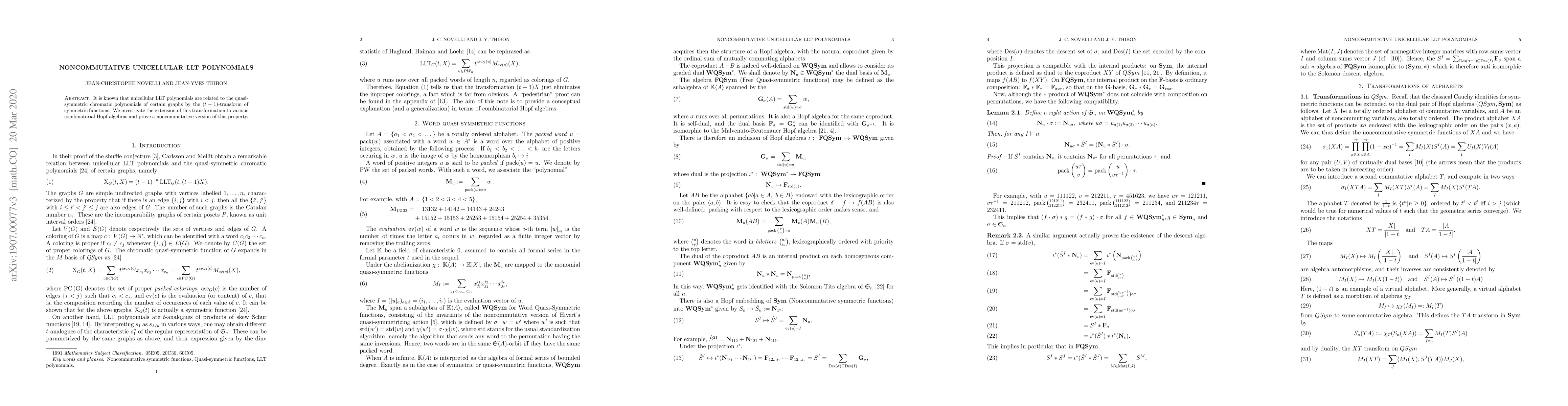 It is known that unicellular LLT polynomials are related to the quasi-symmetric chromatic polynomials of certain graphs by the $(t-1)$-transform of symmetric functions. We investigate the extension of this transformation to various combinatorial Hopf algebras and prove a noncommutative version of this property.
