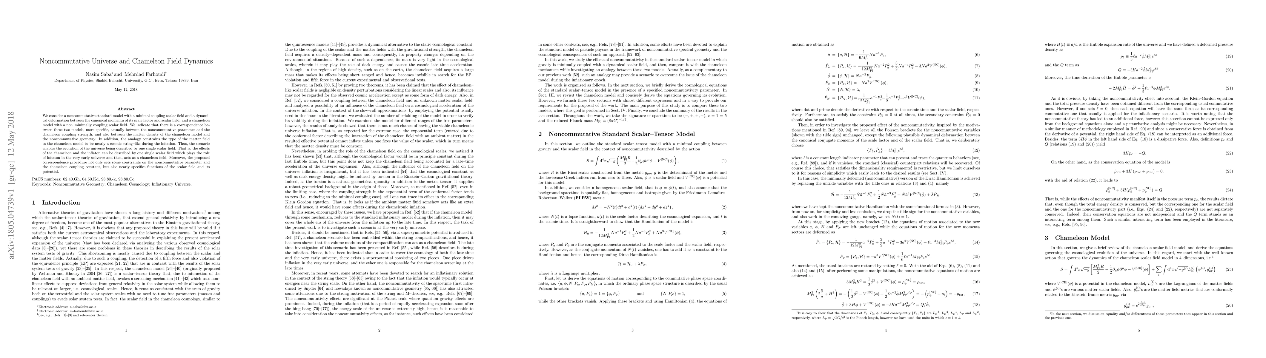 This paper explores the dynamics of a noncommutative standard model with a scalar field and a chameleon model with a non-minimally coupled scalar field, revealing a correspondence between the noncommutative parameter and the chameleon coupling strength, and suggesting a single scalar field can describe both the inflaton and chameleon effects in the universe's evolution.