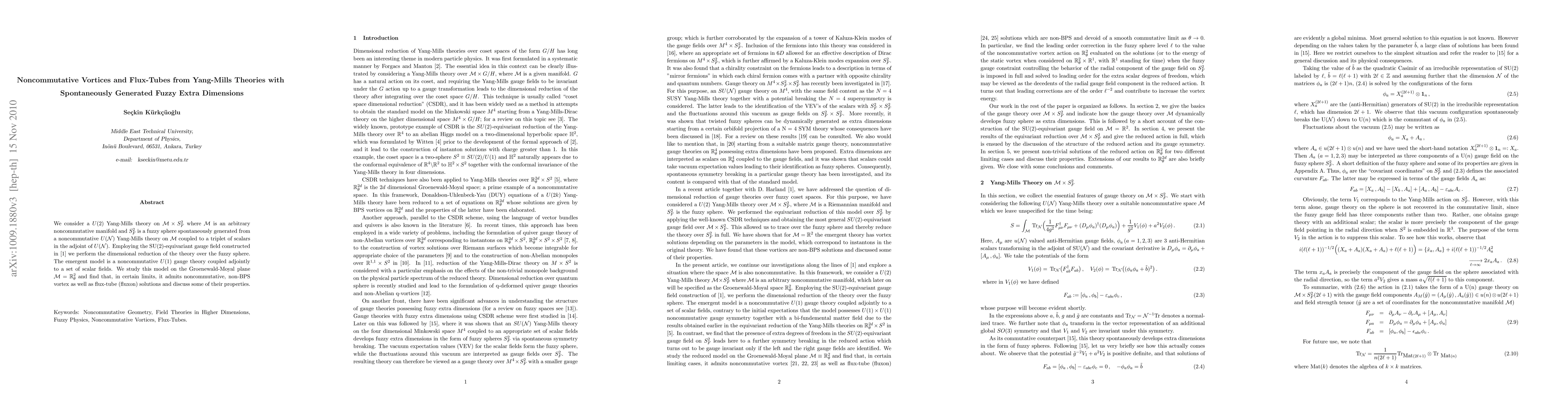 This paper studies a U(2) Yang-Mills theory on a noncommutative manifold with a spontaneously generated fuzzy sphere, reducing it to a noncommutative U(1) gauge theory. It identifies noncommutative vortex and flux-tube solutions in this emergent model on the Groenewald-Moyal plane.