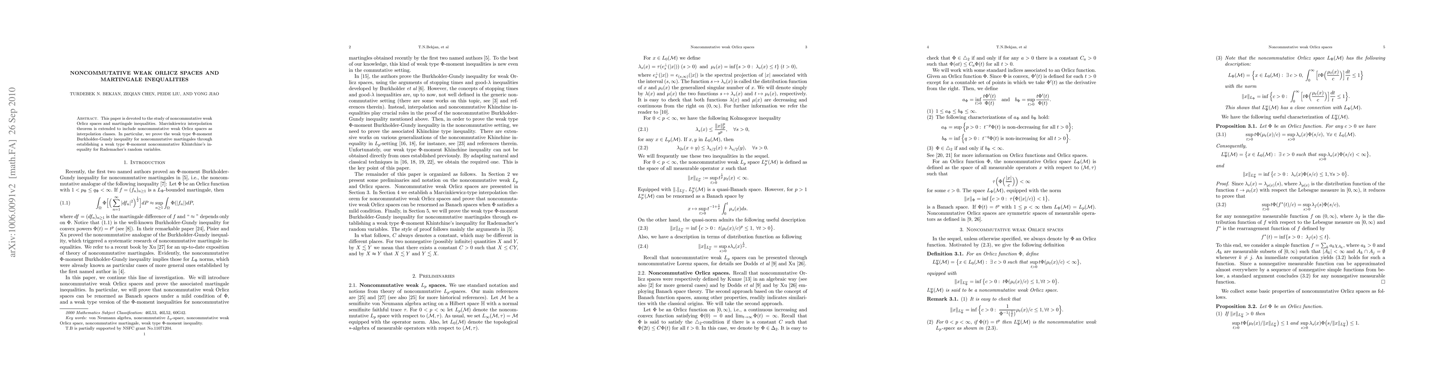 This paper extends the Marcinkiewicz interpolation theorem to noncommutative weak Orlicz spaces and proves the weak type $\Phi$-moment Burkholder-Gundy inequality for noncommutative martingales via a new weak type $\Phi$-moment noncommutative Khintchine's inequality for Rademacher's random variables.