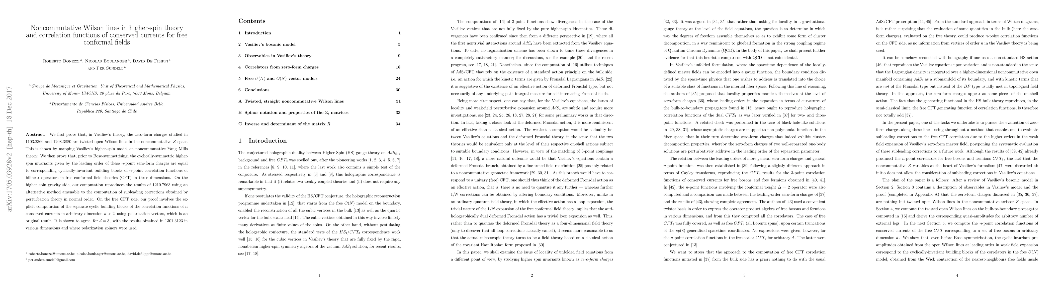 We first prove that, in Vasiliev's theory, the zero-form charges studied in 1103.2360 and 1208.3880 are twisted open Wilson lines in the noncommutative $Z$ space. This is shown by mapping Vasiliev's higher-spin model on noncommutative Yang--Mills theory. We then prove that, prior to Bose-symmetrising, the cyclically-symmetric higher-spin invariants given by the leading order of these $n$-point zero-form charges are equal to corresponding cyclically-invariant building blocks of $n$-point correlation functions of bilinear operators in free conformal field theories (CFT) in three dimensions. On the higher spin gravity side, our computation reproduces the results of 1210.7963 using an alternative method amenable to the computation of subleading corrections obtained by perturbation theory in normal order. On the free CFT side, our proof involves the explicit computation of the separate cyclic building blocks of the correlation functions of $n$ conserved currents in arbitrary dimension $d>2$, using polarization vectors, which is an original result. It is shown to agree, for $d=3$, with the results obtained in 1301.3123 in various dimensions and where polarization spinors were used.
