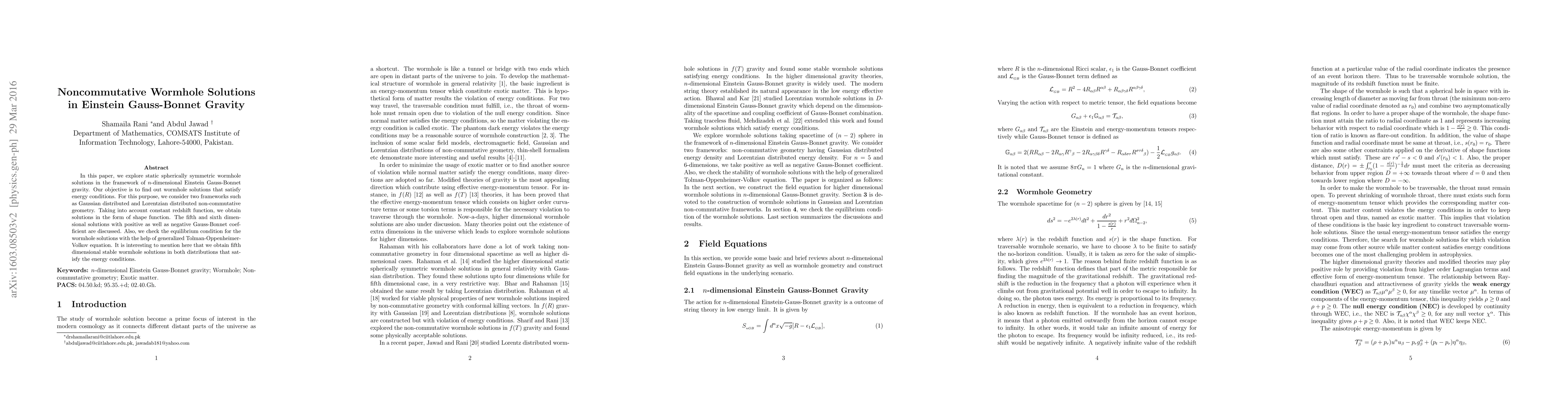 This paper investigates static spherically symmetric wormhole solutions in $n$-dimensional Einstein Gauss-Bonnet gravity, focusing on non-commutative geometry frameworks. It finds stable fifth-dimensional wormhole solutions in both Gaussian and Lorentzian distributions that satisfy energy conditions.