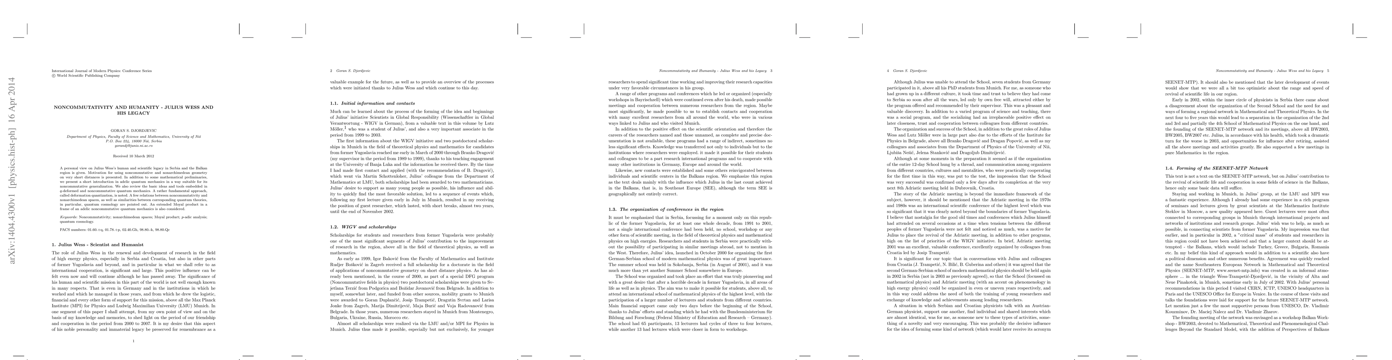 This paper provides a personal reflection on Julius Wess's scientific and human legacy in Serbia and the Balkans, emphasizing the use of noncommutative and nonarchimedean geometry for short-distance phenomena. It introduces adelic quantum mechanics and discusses $q$-deformed and noncommutative quantum mechanics through deformation quantization.