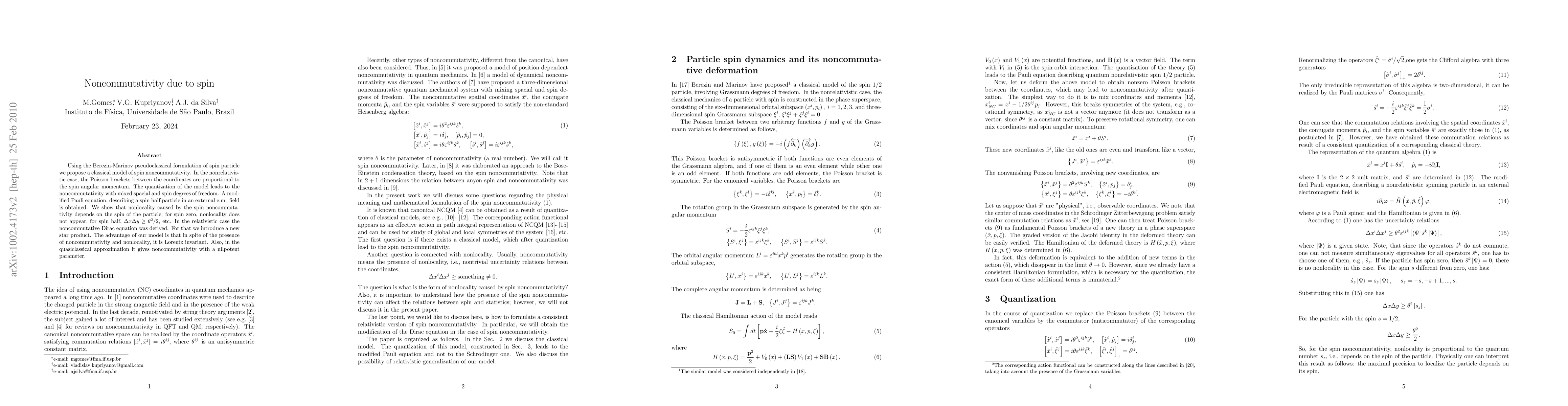 This paper proposes a classical model of spin noncommutativity using the Berezin-Marinov formulation, showing that Poisson brackets between coordinates are proportional to spin angular momentum. The quantization results in a modified Pauli equation with mixed spatial and spin degrees of freedom, revealing nonlocality dependent on the particle's spin, and a relativistic noncommutative Dirac equation with a new star product, maintaining Lorentz invariance.