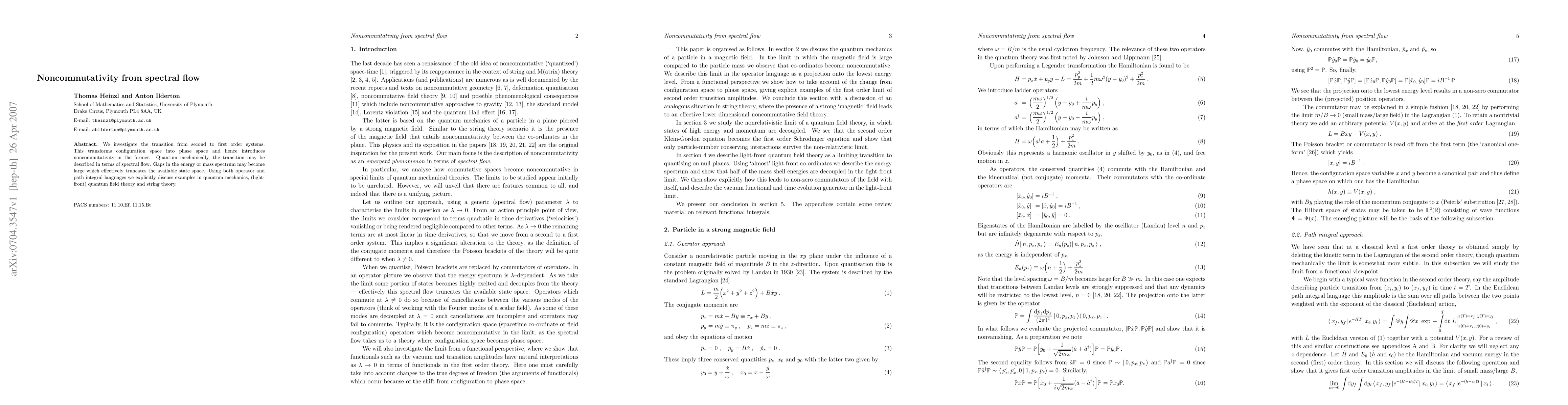 We investigate the transition from second to first order systems. This transforms configuration space into phase space and hence introduces noncommutativity in the former. Quantum mechanically, the transition may be described in terms of spectral flow. Gaps in the energy or mass spectrum may become large which effectively truncates the available state space. Using both operator and path integral languages we explicitly discuss examples in quantum mechanics, (light-front) quantum field theory and string theory.