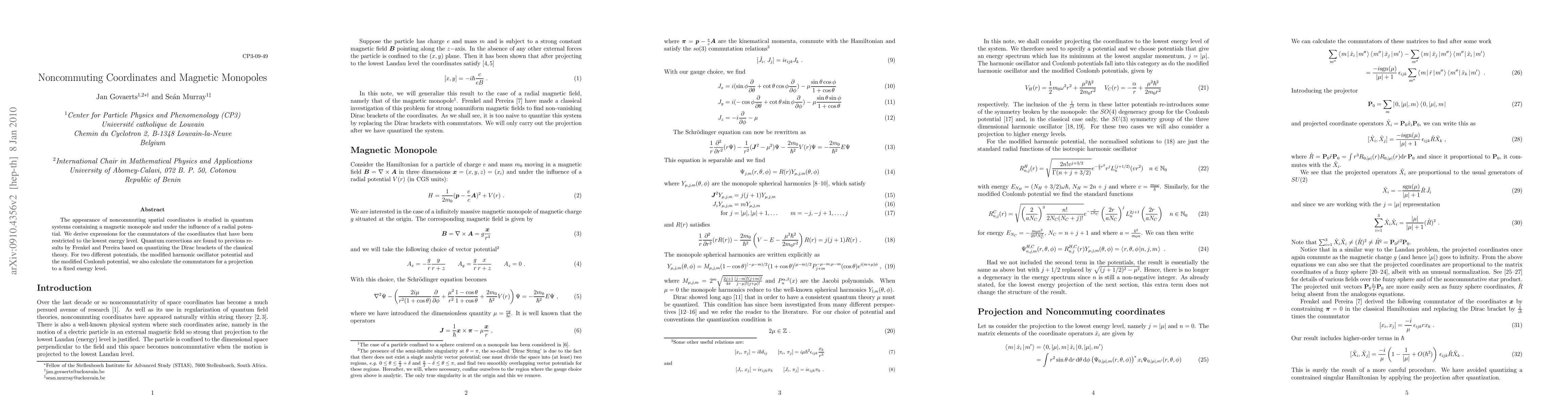 This paper investigates noncommuting spatial coordinates in quantum systems with magnetic monopoles and radial potentials, deriving new commutator expressions for the lowest energy level. It corrects previous results by quantizing Dirac brackets and calculates commutators for fixed energy levels under modified harmonic and Coulomb potentials.