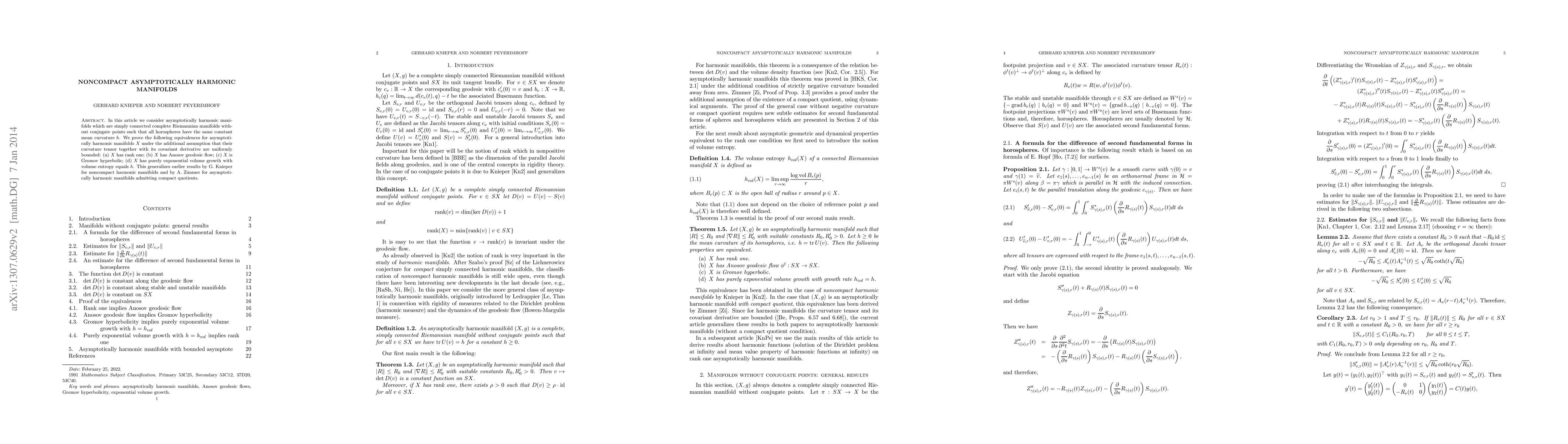This paper proves equivalences for noncompact asymptotically harmonic manifolds with bounded curvature and covariant derivatives: (a) rank one, (b) Anosov geodesic flow, (c) Gromov hyperbolicity, and (d) purely exponential volume growth with entropy $h$, generalizing prior work by Knieper and Zimmer.