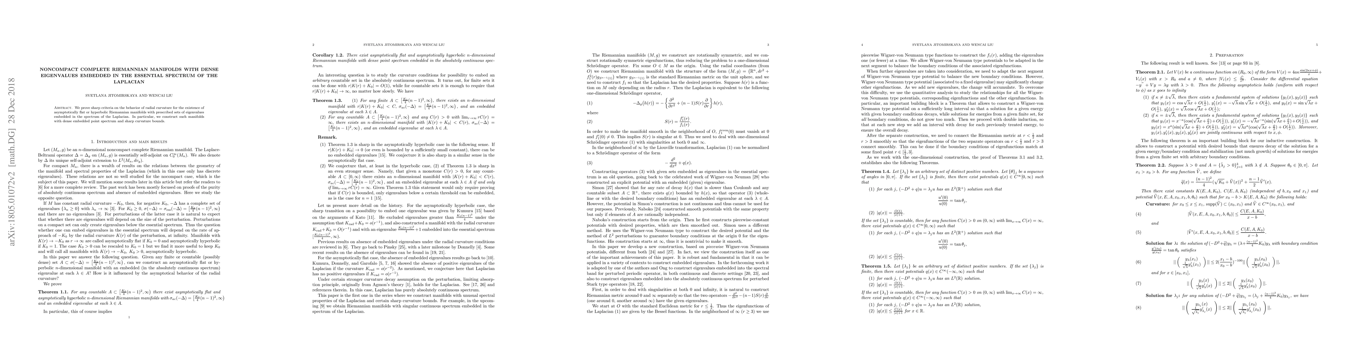 This paper establishes precise conditions for the radial curvature of noncompact complete Riemannian manifolds, ensuring the existence of asymptotically flat or hyperbolic manifolds with prescribed sets of eigenvalues embedded in the Laplacian's spectrum, including those with dense point spectrum and tight curvature bounds.