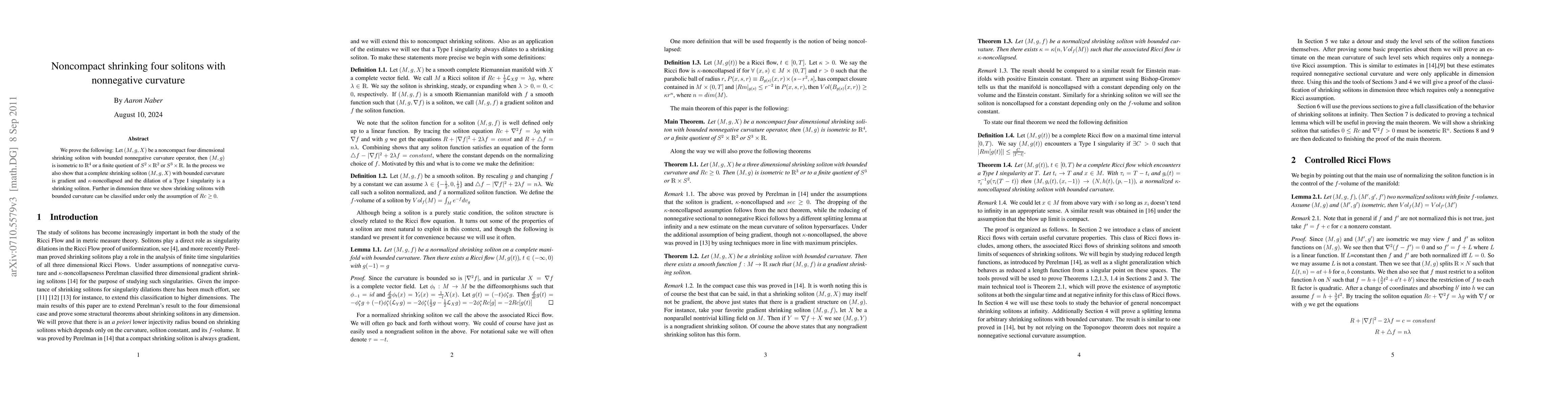We prove the following: Let (M,g,X) be a noncompact four dimensional shrinking soliton with bounded nonnegative curvature operator, then (M,g) is isometric to R^4 or a finite quotient of S^2xR^2 or S^3xR. In the process we also show that a complete shrinking soliton (M,g,X) with bounded curvature is gradient and k-noncollapsed and the dilation of a Type I singularity is a shrinking soliton. Further in dimension three we show shrinking solitons with bounded curvature can be classified under only the assumption of Rc>= 0.
