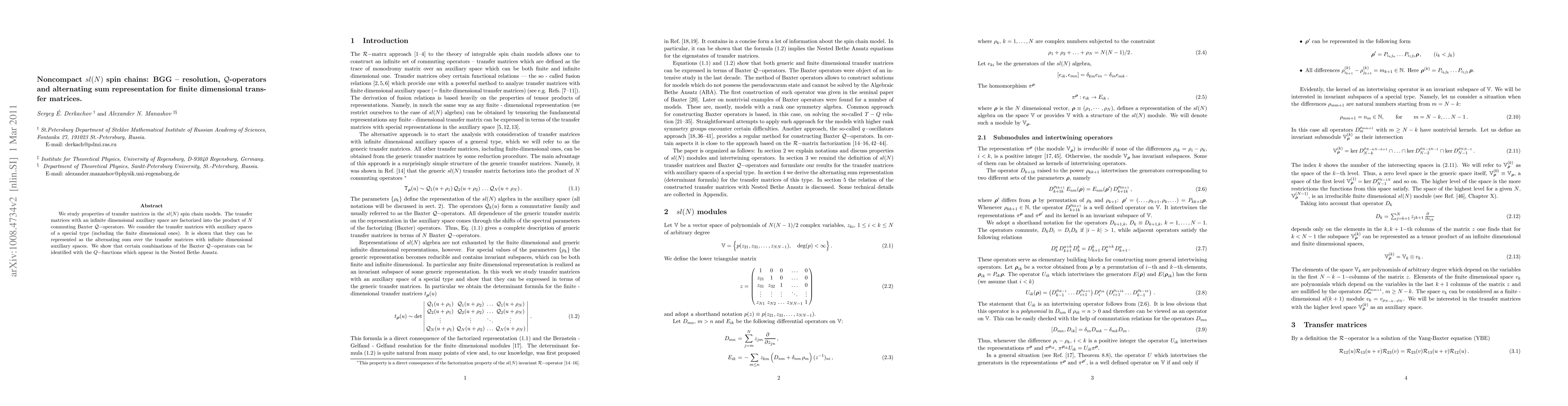 This research explores transfer matrices in sl(N) spin chain models, demonstrating their factorization into N commuting Baxter Q-operators. It reveals that finite-dimensional transfer matrices can be represented as an alternating sum of those with infinite-dimensional spaces, linking certain Q-operator combinations to Q-functions in the Nested Bethe Ansatz.
