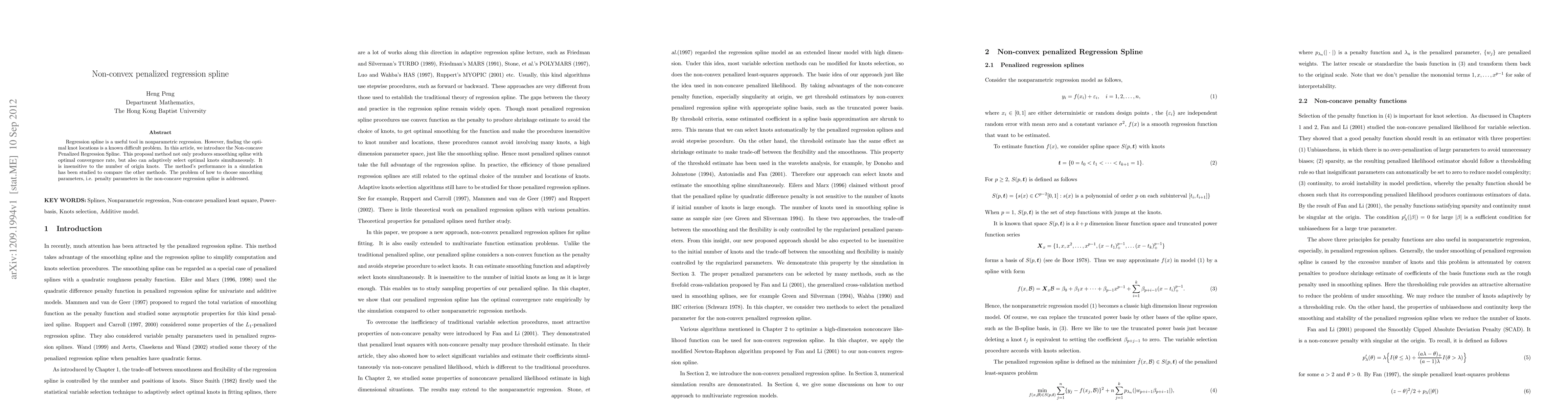 This paper introduces a Nonconcave Penalized Regression Spline that adaptively selects optimal knots and achieves optimal convergence rates. The method's performance is compared with other techniques in simulations, and it addresses the challenge of choosing appropriate smoothing parameters.