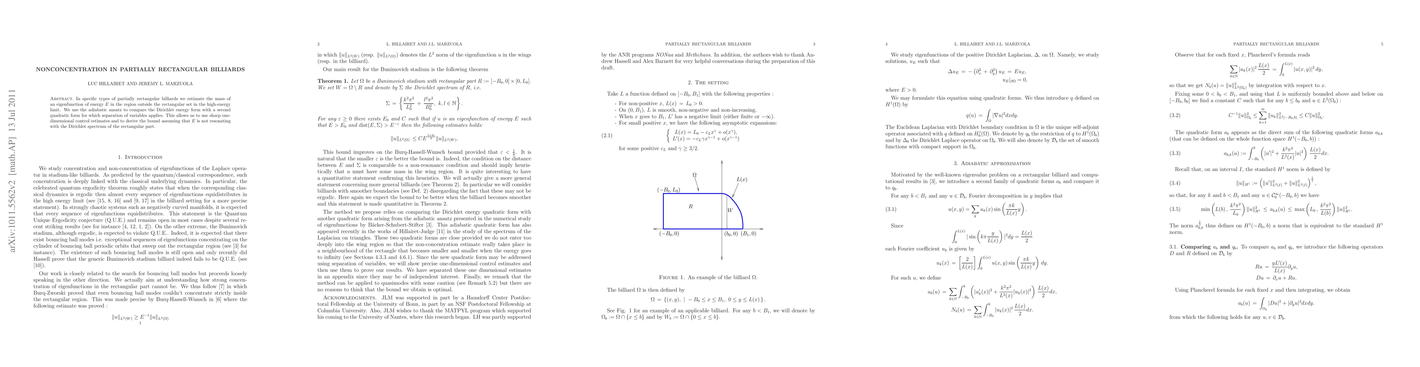 In specific types of partially rectangular billiards we estimate the mass of an eigenfunction of energy $E$ in the region outside the rectangular set in the high-energy limit. We use the adiabatic ansatz to compare the Dirichlet energy form with a second quadratic form for which separation of variables applies. This allows us to use sharp one-dimensional control estimates and to derive the bound assuming that $E$ is not resonating with the Dirichlet spectrum of the rectangular part.