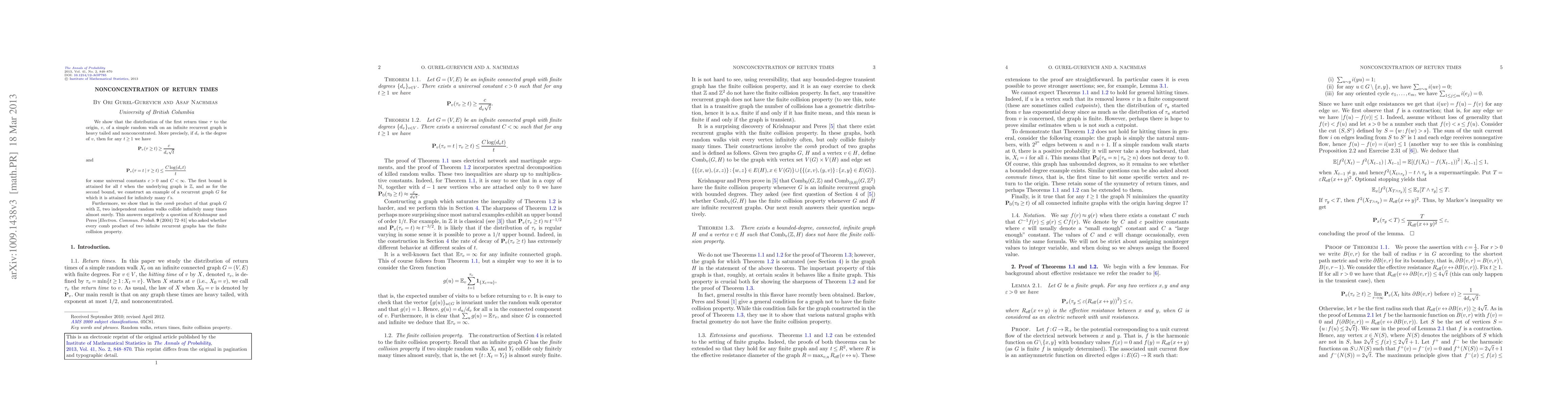We show that the distribution of the first return time $\tau$ to the origin, v, of a simple random walk on an infinite recurrent graph is heavy tailed and nonconcentrated. More precisely, if $d_v$ is the degree of v, then for any $t\geq1$ we have \[\mathbf{P}_v(\tau\ge t)\ge\frac{c}{d_v\sqrt{t}}\] and \[\mathbf{P}_v(\tau=t\mid\tau\geq t)\leq\frac{C\log(d_vt)}{t}\] for some universal constants $c>0$ and $C<\infty$. The first bound is attained for all t when the underlying graph is $\mathbb{Z}$, and as for the second bound, we construct an example of a recurrent graph G for which it is attained for infinitely many t's. Furthermore, we show that in the comb product of that graph G with $\mathbb{Z}$, two independent random walks collide infinitely many times almost surely. This answers negatively a question of Krishnapur and Peres [Electron. Commun. Probab. 9 (2004) 72-81] who asked whether every comb product of two infinite recurrent graphs has the finite collision property.