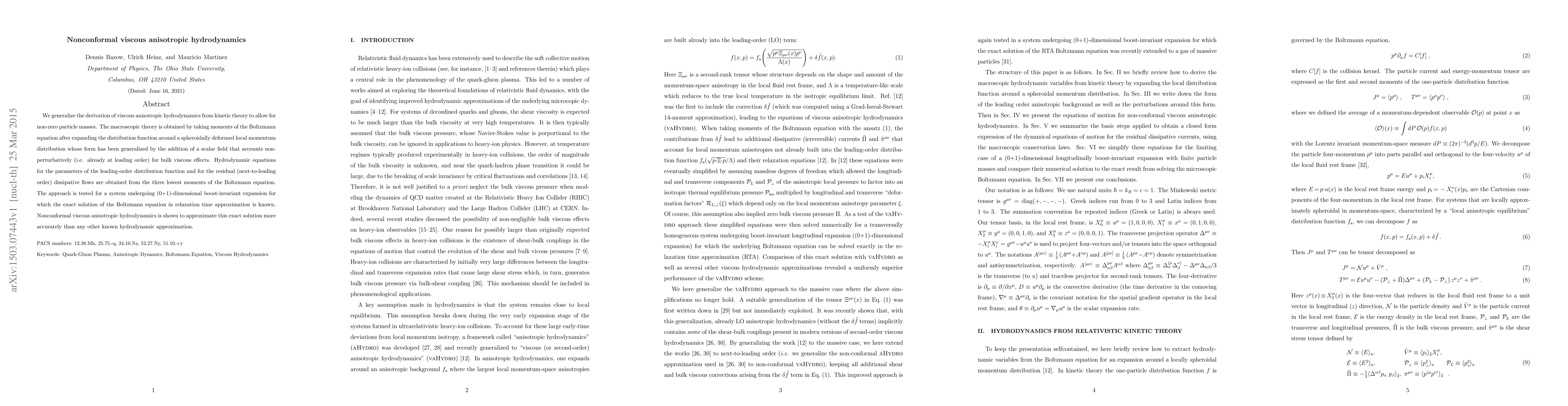 We generalize the derivation of viscous anisotropic hydrodynamics from kinetic theory to allow for non-zero particle masses. The macroscopic theory is obtained by taking moments of the Boltzmann equation after expanding the distribution function around a spheroidally deformed local momentum distribution whose form has been generalized by the addition of a scalar field that accounts non-perturbatively (i.e. already at leading order) for bulk viscous effects. Hydrodynamic equations for the parameters of the leading-order distribution function and for the residual (next-to-leading order) dissipative flows are obtained from the three lowest moments of the Boltzmann equation. The approach is tested for a system undergoing (0+1)-dimensional boost-invariant expansion for which the exact solution of the Boltzmann equation in relaxation time approximation is known. Nonconformal viscous anisotropic hydrodynamics is shown to approximate this exact solution more accurately than any other known hydrodynamic approximation.