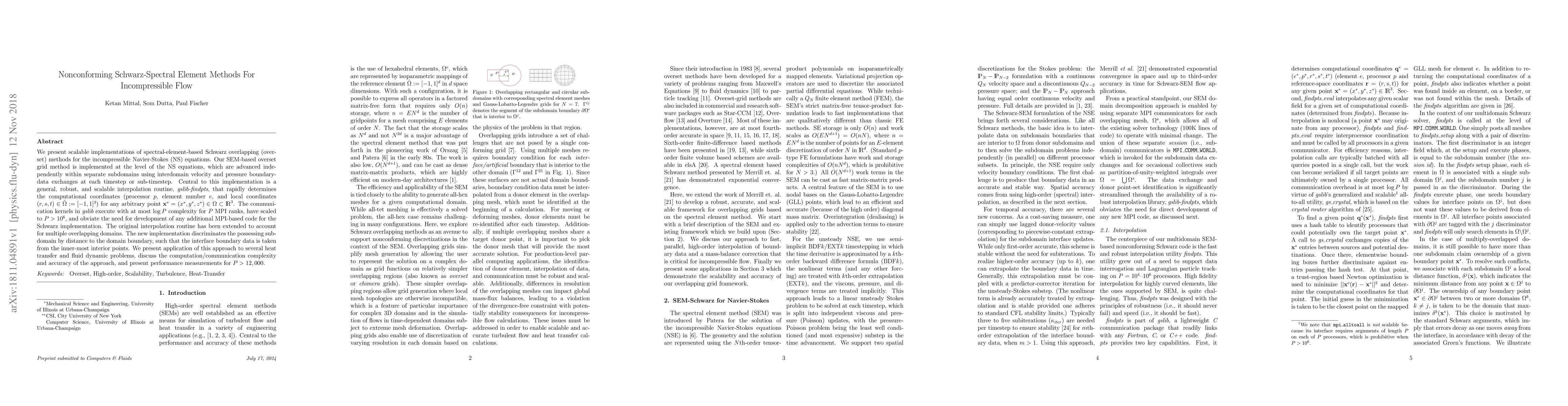 This paper introduces scalable Schwarz-spectral element methods for solving incompressible Navier-Stokes equations, featuring robust interpolation routines for overlapping subdomains and efficient communication kernels that scale to millions of processors. Performance is demonstrated through various fluid dynamics applications.