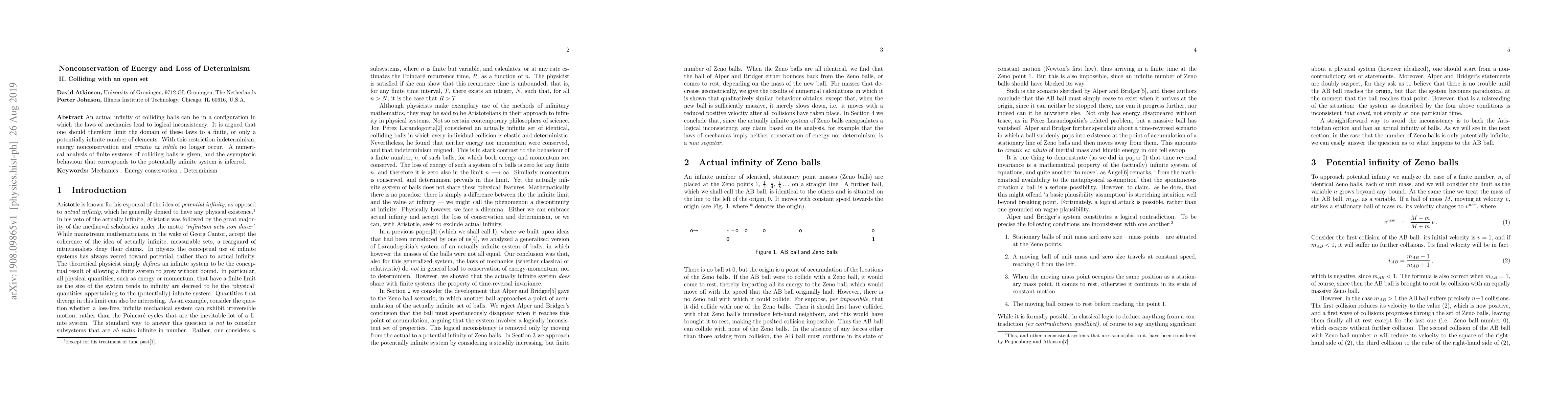 An actual infinity of colliding balls can be in a configuration in which the laws of mechanics lead to logical inconsistency. It is argued that one should therefore limit the domain of these laws to a finite, or only a potentially infinite number of elements. With this restriction indeterminism, energy non-conservation and (creatio ex nihilo) no longer occur. A numerical analysis of finite systems of colliding balls is given, and the asymptotic behavior that corresponds to the potentially infinite system is inferred.