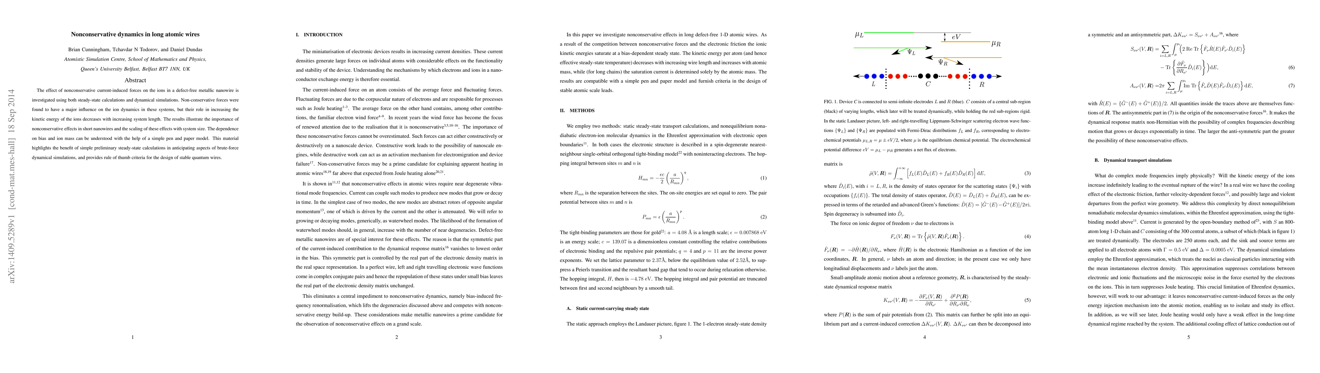 The effect of nonconservative current-induced forces on the ions in a defect-free metallic nanowire is investigated using both steady-state calculations and dynamical simulations. Non-conservative forces were found to have a major influence on the ion dynamics in these systems, but their role in increasing the kinetic energy of the ions decreases with increasing system length. The results illustrate the importance of nonconservative effects in short nanowires and the scaling of these effects with system size. The dependence on bias and ion mass can be understood with the help of a simple pen and paper model. This material highlights the benefit of simple preliminary steady-state calculations in anticipating aspects of brute-force dynamical simulations, and provides rule of thumb criteria for the design of stable quantum wires.