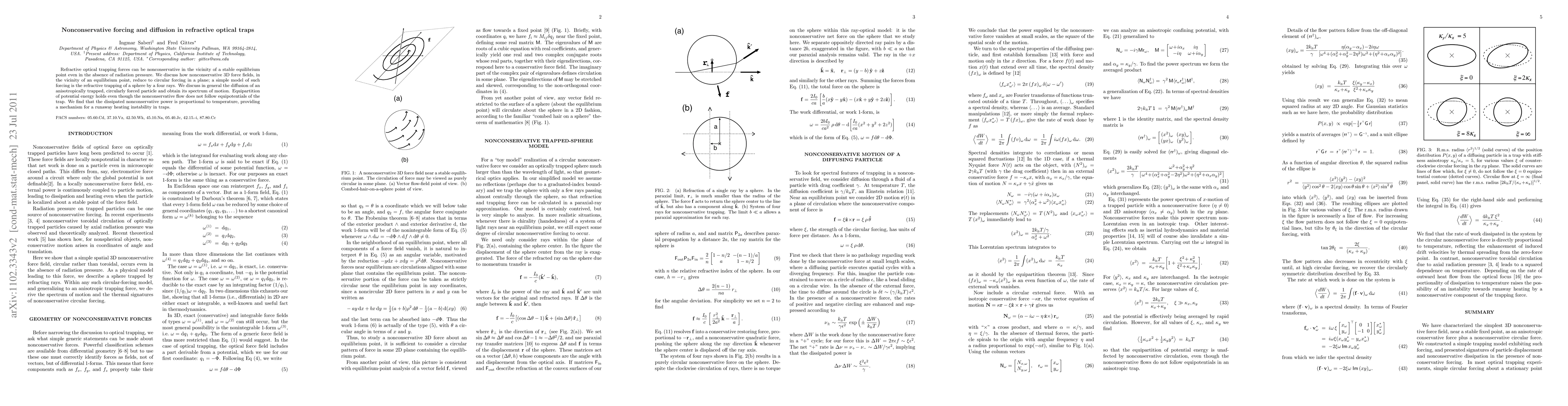 This paper explores nonconservative forces in refractive optical traps near stable equilibrium points, revealing that these forces can reduce to circular forcing in a plane. The study also investigates the diffusion and motion spectrum of particles under such conditions, finding equipartition of potential energy despite nonconservative flow, and identifies a mechanism for runaway heating instability.