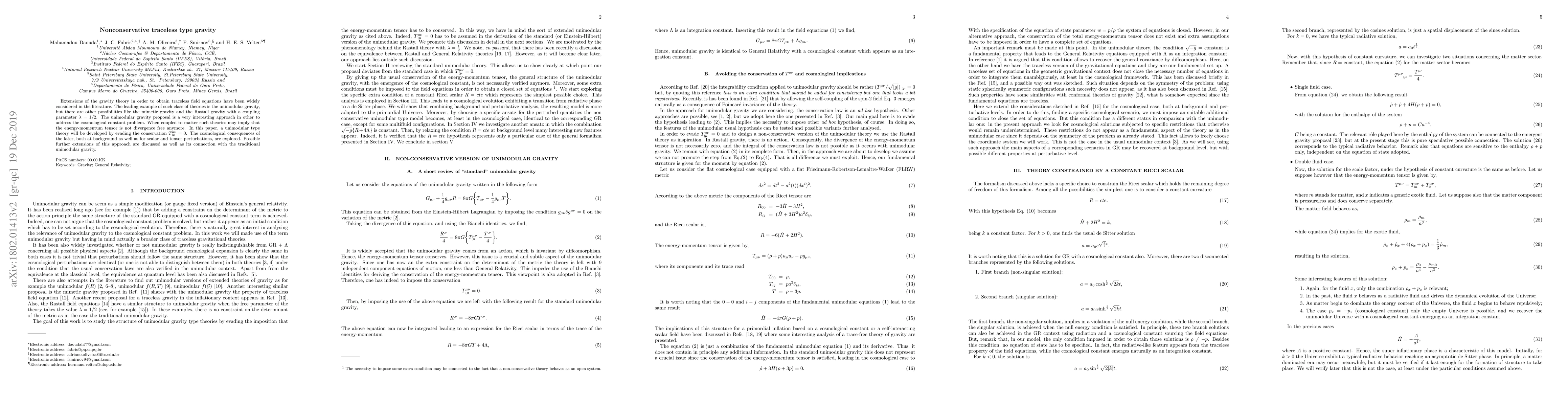 Extensions of the gravity theory in order to obtain traceless field equations have been widely considered in the literature. The leading example of such class of theories is the unimodular gravity, but there are other possibilities like the mimetic gravity and the Rastall gravity with a coupling parameter $\lambda = 1/2$. The unimodular gravity proposal is a very interesting approach in other to address the cosmological constant problem. When coupled to matter such theories may imply that the energy-momentum tensor is not divergence free anymore. In this paper, a unimodular type theory will be developed by evading the conservation $T^{\mu\nu}_{\, ; \mu}=0$. The cosmological consequences of the later, both at background as well as for scalar and tensor perturbations, are explored. Possible further extensions of this approach are discussed as well as its connection with the traditional unimodular gravity.