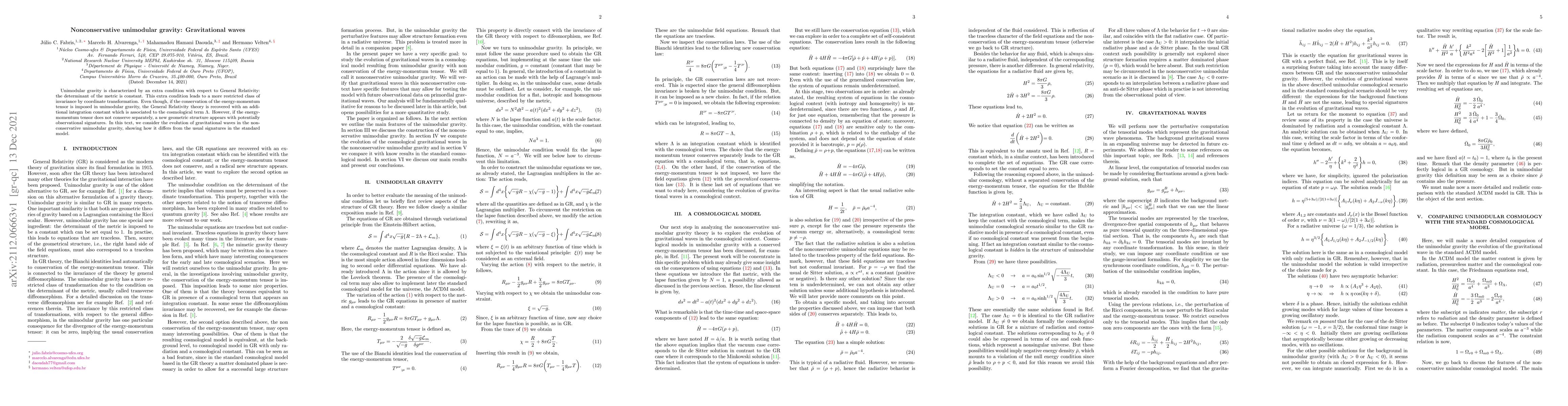 Unimodular gravity modifies General Relativity by imposing a constant metric determinant, leading to distinct gravitational wave signatures when energy-momentum conservation is not strictly enforced. This nonconservative variant reveals unique observational features differing from those predicted by General Relativity.