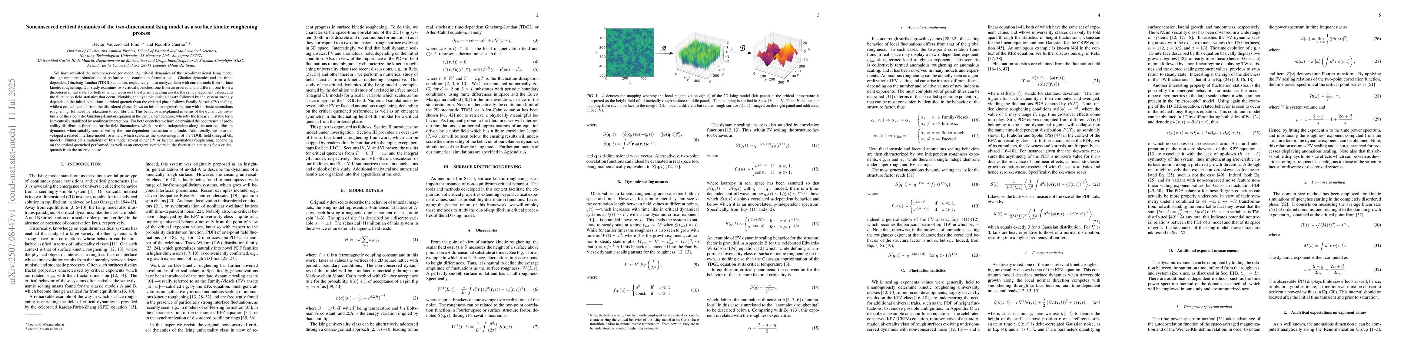 The research employs numerical simulations of lattice and continuum formulations of the non-conserved (model A) critical dynamics of the two-dimensional Ising model, specifically Glauber dynamics and the time-dependent Ginzburg-Landau (TDGL) equation, analyzed using modern surface kinetic roughening tools.
