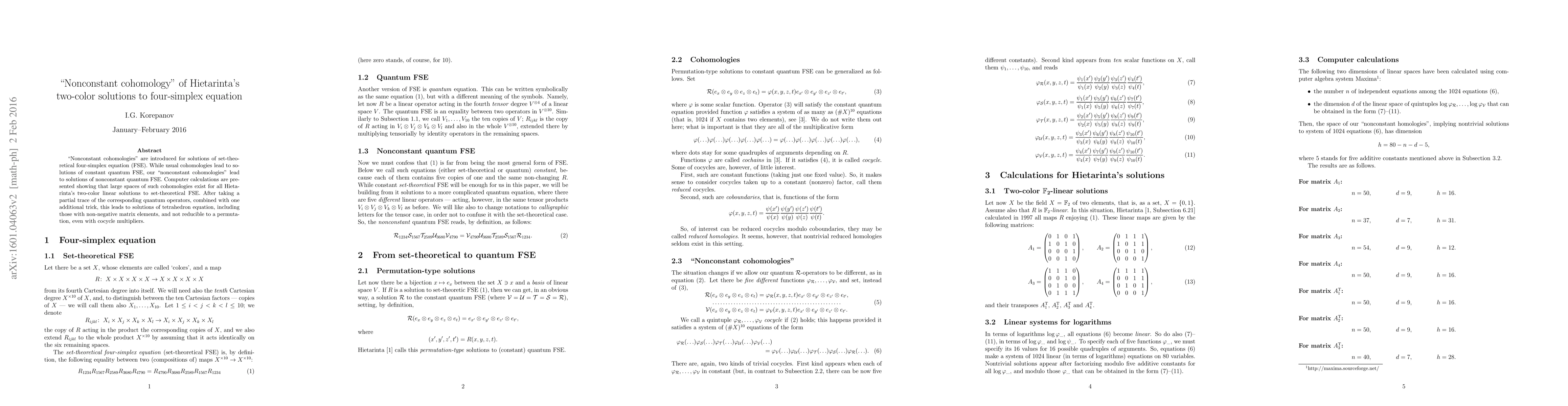This paper introduces "nonconstant cohomologies" for solutions of the set-theoretical four-simplex equation, leading to nonconstant quantum solutions. Computer calculations reveal large spaces of these cohomologies for Hietarinta's two-color linear solutions, ultimately yielding solutions of the tetrahedron equation with non-negative matrix elements.