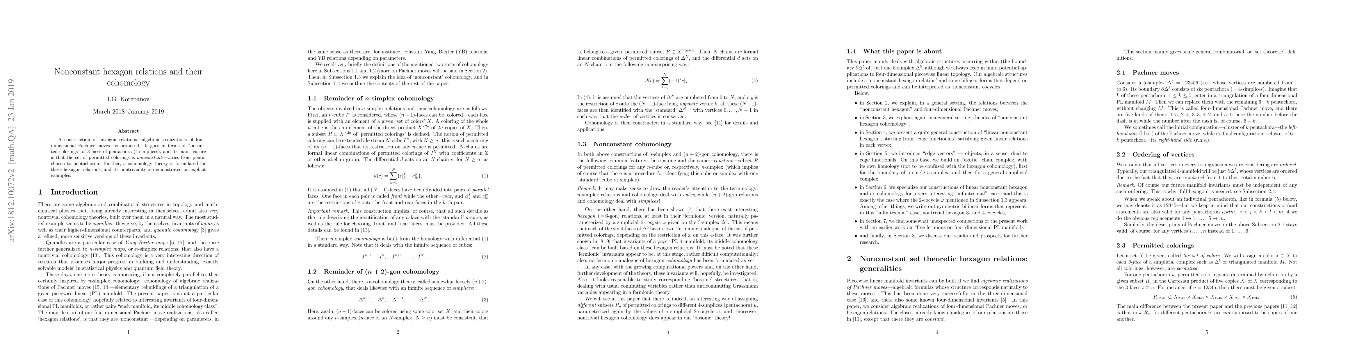 Researchers propose a new construction of hexagon relations using permitted colorings of 3-faces on pentachora, leading to a nonconstant cohomology theory that demonstrates its nontriviality in specific examples.