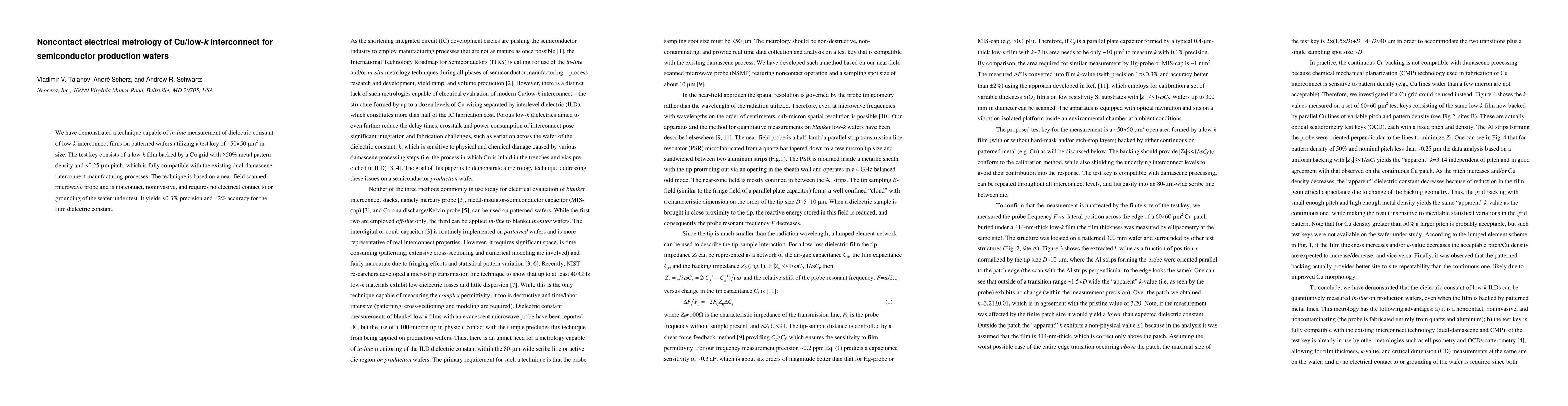 Summary: This paper presents a noncontact, non-invasive microwave probe technique for in-line measurement of the dielectric constant of low-k interconnect films on semiconductor wafers, achieving <0.3% precision and 2% accuracy, compatible with existing manufacturing processes.