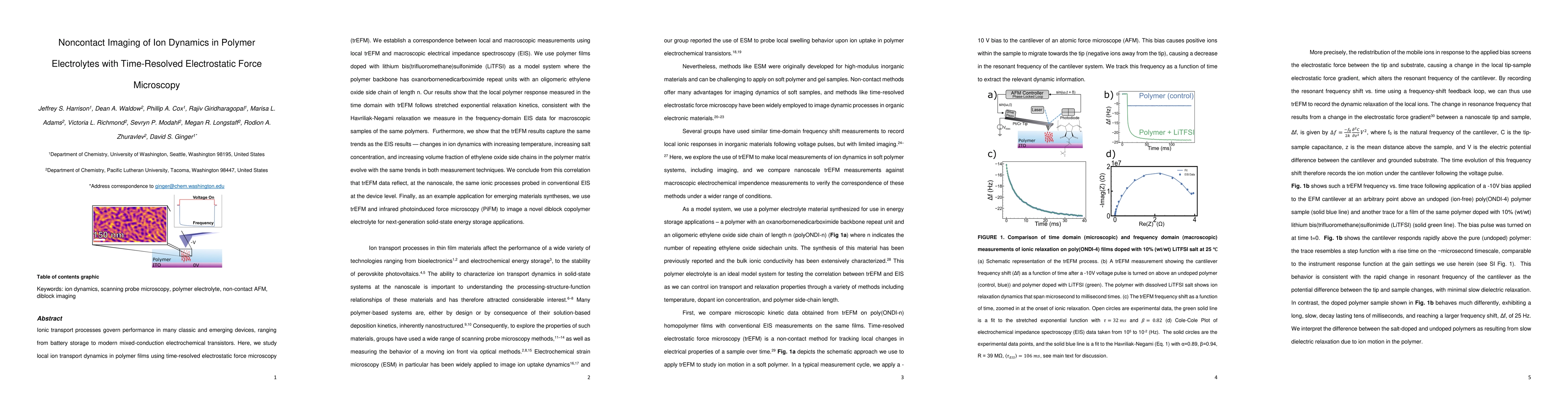 Ionic transport processes govern performance in many classic and emerging devices, ranging from battery storage to modern mixed-conduction electrochemical transistors. Here, we study local ion transport dynamics in polymer films using time-resolved electrostatic force microscopy (trEFM). We establish a correspondence between local and macroscopic measurements using local trEFM and macroscopic electrical impedance spectroscopy (EIS). We use polymer films doped with lithium bis(trifluoromethane)sulfonimide (LiTFSI) as a model system where the polymer backbone has oxanorbornenedicarboximide repeat units with an oligomeric ethylene oxide side chain of length n. Our results show that the local polymer response measured in the time domain with trEFM follows stretched exponential relaxation kinetics, consistent with the Havriliak-Negami relaxation we measure in the frequency-domain EIS data for macroscopic samples of the same polymers. Furthermore, we show that the trEFM results capture the same trends as the EIS results-changes in ion dynamics with increasing temperature, increasing salt concentration, and increasing volume fraction of ethylene oxide side chains in the polymer matrix evolve with the same trends in both measurement techniques. We conclude from this correlation that trEFM data reflect, at the nanoscale, the same ionic processes probed in conventional EIS at the device level. Finally, as an example application for emerging materials syntheses, we use trEFM and infrared photoinduced force microscopy (PiFM) to image a novel diblock copolymer electrolyte for next-generation solid-state energy storage applications.