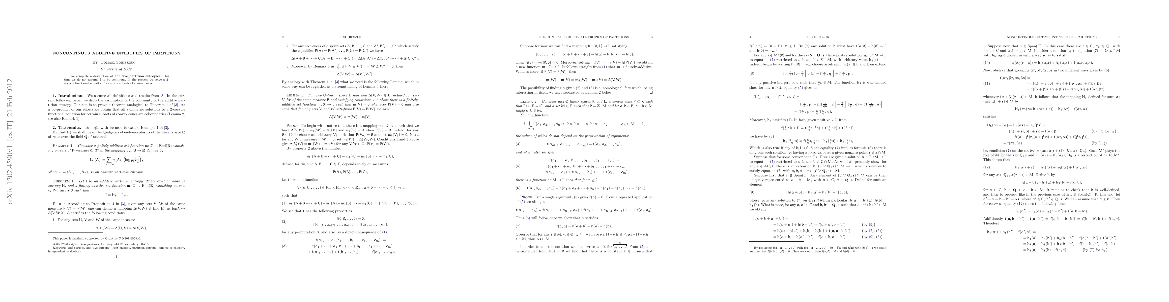 Researchers extend additive partition entropies to non-continuous functions without assuming stochastic independence, solving a functional equation as a byproduct.