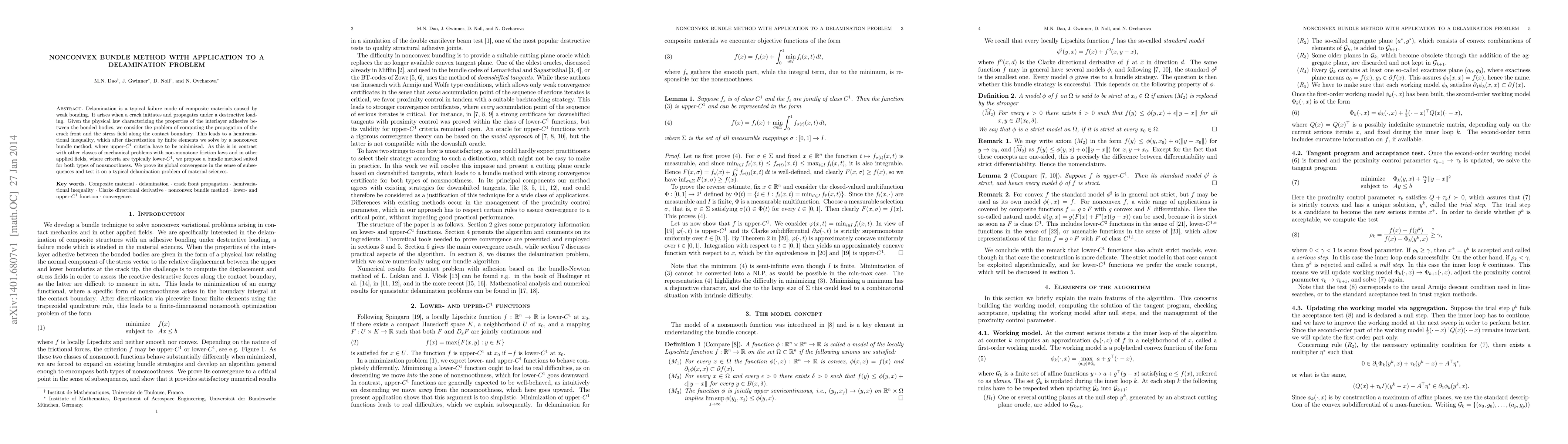 Researchers developed a nonconvex bundle method to solve a delamination problem in composite materials, achieving global convergence for both types of nonsmoothness, and applied it to a typical material sciences test case.