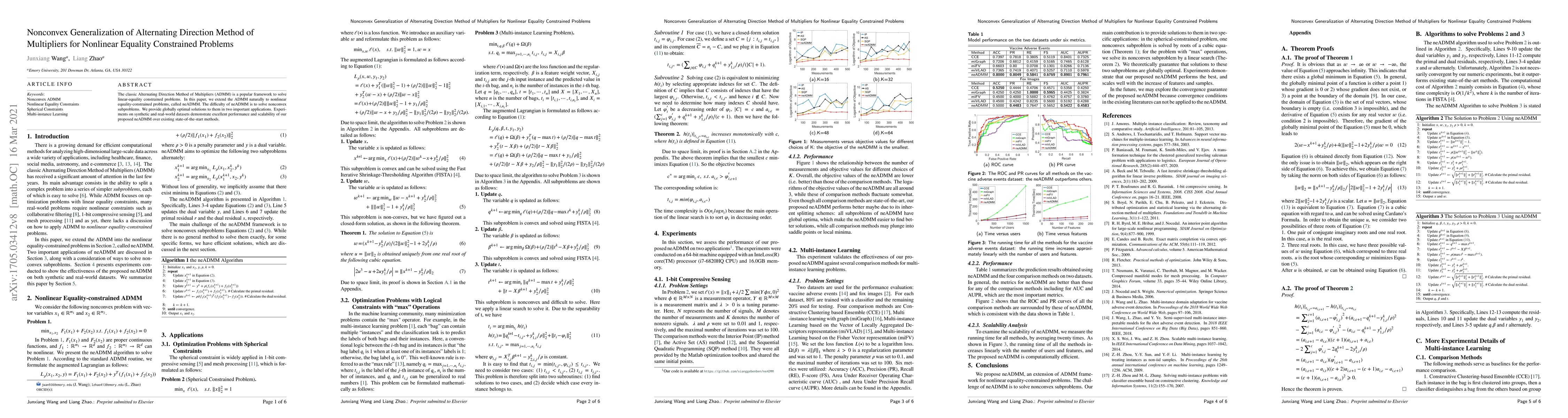 The classic Alternating Direction Method of Multipliers (ADMM) is a popular framework to solve linear-equality constrained problems. In this paper, we extend the ADMM naturally to nonlinear equality-constrained problems, called neADMM. The difficulty of neADMM is to solve nonconvex subproblems. We provide globally optimal solutions to them in two important applications. Experiments on synthetic and real-world datasets demonstrate excellent performance and scalability of our proposed neADMM over existing state-of-the-start methods.