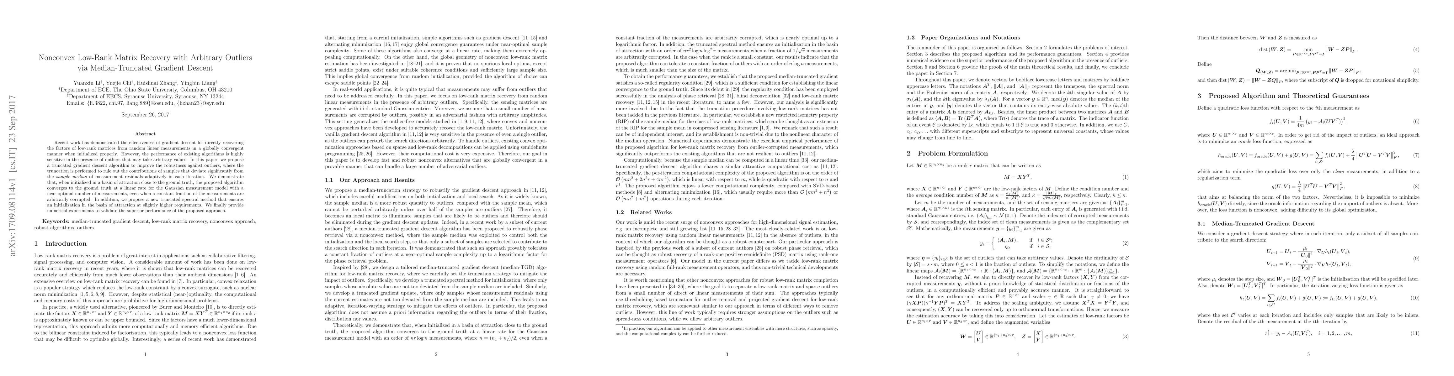 Recent work has demonstrated the effectiveness of gradient descent for directly recovering the factors of low-rank matrices from random linear measurements in a globally convergent manner when initialized properly. However, the performance of existing algorithms is highly sensitive in the presence of outliers that may take arbitrary values. In this paper, we propose a truncated gradient descent algorithm to improve the robustness against outliers, where the truncation is performed to rule out the contributions of samples that deviate significantly from the {\em sample median} of measurement residuals adaptively in each iteration. We demonstrate that, when initialized in a basin of attraction close to the ground truth, the proposed algorithm converges to the ground truth at a linear rate for the Gaussian measurement model with a near-optimal number of measurements, even when a constant fraction of the measurements are arbitrarily corrupted. In addition, we propose a new truncated spectral method that ensures an initialization in the basin of attraction at slightly higher requirements. We finally provide numerical experiments to validate the superior performance of the proposed approach.