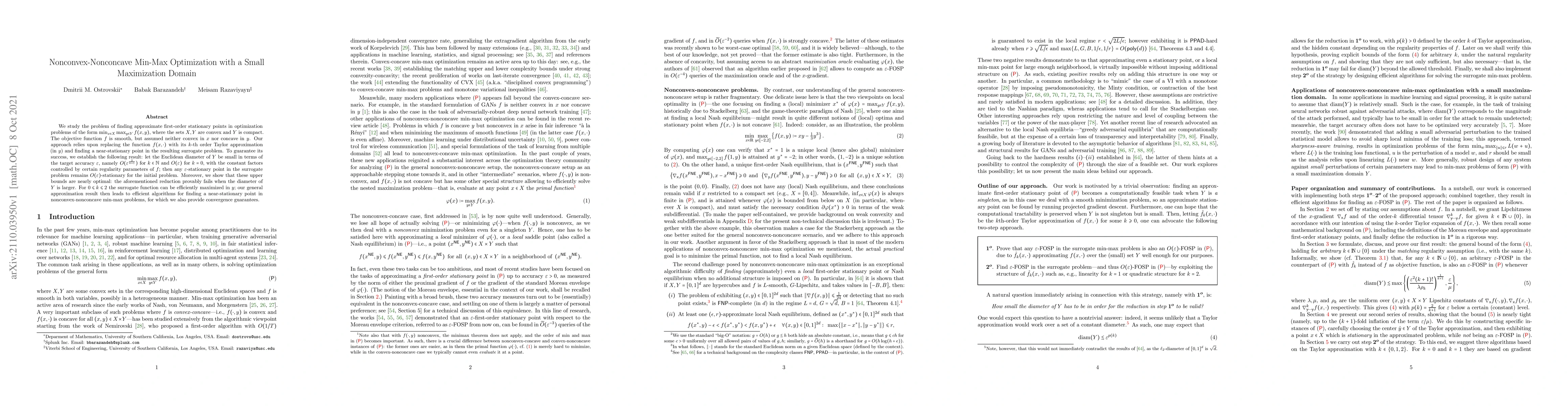 We study the problem of finding approximate first-order stationary points in optimization problems of the form $\min_{x \in X} \max_{y \in Y} f(x,y)$, where the sets $X,Y$ are convex and $Y$ is compact. The objective function $f$ is smooth, but assumed neither convex in $x$ nor concave in $y$. Our approach relies upon replacing the function $f(x,\cdot)$ with its $k$th order Taylor approximation (in $y$) and finding a near-stationary point in the resulting surrogate problem. To guarantee its success, we establish the following result: let the Euclidean diameter of $Y$ be small in terms of the target accuracy $\varepsilon$, namely $O(\varepsilon^{\frac{2}{k+1}})$ for $k \in \mathbb{N}$ and $O(\varepsilon)$ for $k = 0$, with the constant factors controlled by certain regularity parameters of $f$; then any $\varepsilon$-stationary point in the surrogate problem remains $O(\varepsilon)$-stationary for the initial problem. Moreover, we show that these upper bounds are nearly optimal: the aforementioned reduction provably fails when the diameter of $Y$ is larger. For $0 \le k \le 2$ the surrogate function can be efficiently maximized in $y$; our general approximation result then leads to efficient algorithms for finding a near-stationary point in nonconvex-nonconcave min-max problems, for which we also provide convergence guarantees.