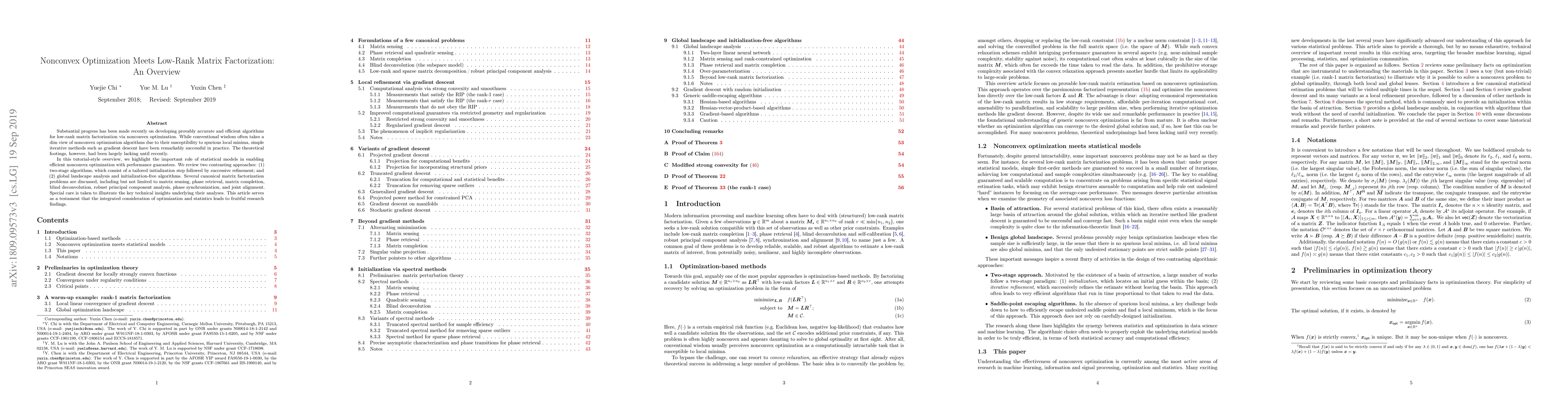 Substantial progress has been made recently on developing provably accurate and efficient algorithms for low-rank matrix factorization via nonconvex optimization. While conventional wisdom often takes a dim view of nonconvex optimization algorithms due to their susceptibility to spurious local minima, simple iterative methods such as gradient descent have been remarkably successful in practice. The theoretical footings, however, had been largely lacking until recently. In this tutorial-style overview, we highlight the important role of statistical models in enabling efficient nonconvex optimization with performance guarantees. We review two contrasting approaches: (1) two-stage algorithms, which consist of a tailored initialization step followed by successive refinement; and (2) global landscape analysis and initialization-free algorithms. Several canonical matrix factorization problems are discussed, including but not limited to matrix sensing, phase retrieval, matrix completion, blind deconvolution, robust principal component analysis, phase synchronization, and joint alignment. Special care is taken to illustrate the key technical insights underlying their analyses. This article serves as a testament that the integrated consideration of optimization and statistics leads to fruitful research findings.