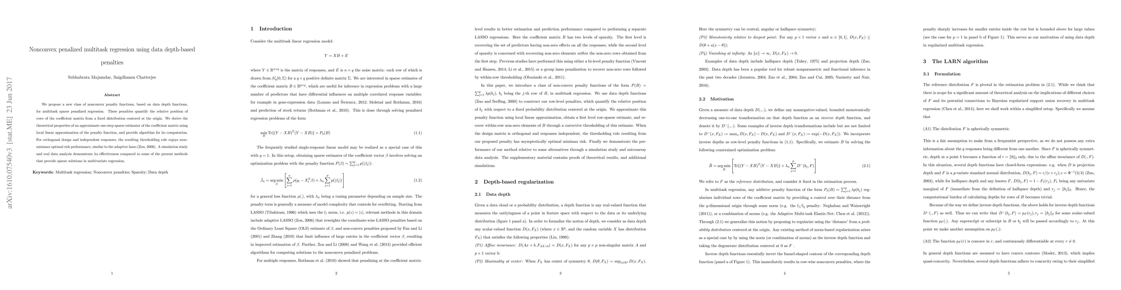 This paper introduces nonconvex penalty functions based on data depth for multitask sparse regression, deriving theoretical properties and an algorithm for an approximate one-step sparse estimator. The proposed method achieves near-minimax optimal risk performance and outperforms existing methods in simulations and real data analysis.
